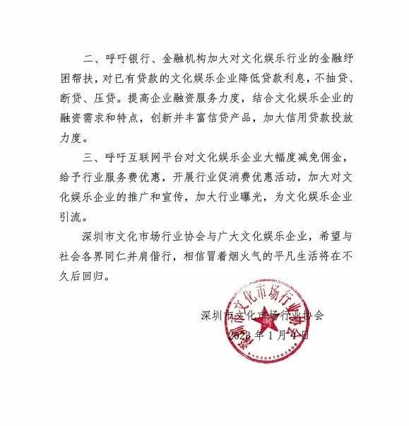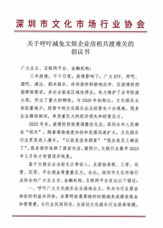 三年疫情,千个日夜。疫情影响下,广大KTV、网吧、酒吧、演出、剧本娱乐、休闲场所积极响应市、区疫情防控指挥部要求,多次全面或区域性停业,有力维护了全市防疫大局,作出了重大的牺牲。与2020年初相比,文化娱乐主体批量减少,经营中的文化娱乐企业经营也十分艰难,很多企业濒临倒闭,承受着巨大的经济损失和经营压力。2022年末,疫情防控政策调整优化后,深圳全市人民都在“闯关”,随着感染速度加快和范围迅速扩大,文化娱乐行业更是进入凛冬。“以前是没有顾客”“现在连员工都没了”,很多场所选择了提前关店。据预计,文娱行业最早2023年3月份才有望逐步恢复。鉴于文娱企业当前无正常收入,且面临房租、工资、运营、还贷、平台佣金等重重压力,在此,深圳市文化市场行业协会向广大业主方、金融机构、互联网平台发出以下倡议:一、呼吁广大文化娱乐企业场地业主,作为与行业唇齿相依的利益共同体,在黎明前最黑暗的时期减免或缓收租金和管理费,与行业风雨同舟,为深圳文化娱乐行业添柴取暖。二、呼吁银行、金融机构加大对文化娱乐行业的金融纾困帮扶,对已有贷款的文化娱乐企业降低贷款利息,不抽贷、断贷、压贷。提高企业融资服务力度,结合文化娱乐企业的融资需求和特点,创新并丰富信贷产品,加大信用贷款投放力度。三、呼吁互联网平台对文化娱乐企业大幅度减免佣金,给予行业服务费优惠,开展行业促消费优惠活动,加大对文化娱乐企业的推广和宣传,加大行业曝光,为文化娱乐企业引流。深圳市文化市场行业协会与广大文化娱乐企业,希望与社会各界同仁并肩偕行,相信冒着烟火气的平凡生活将在不久后回归。