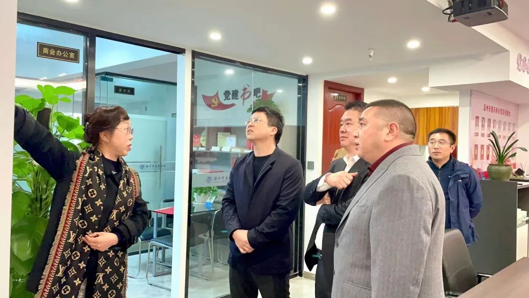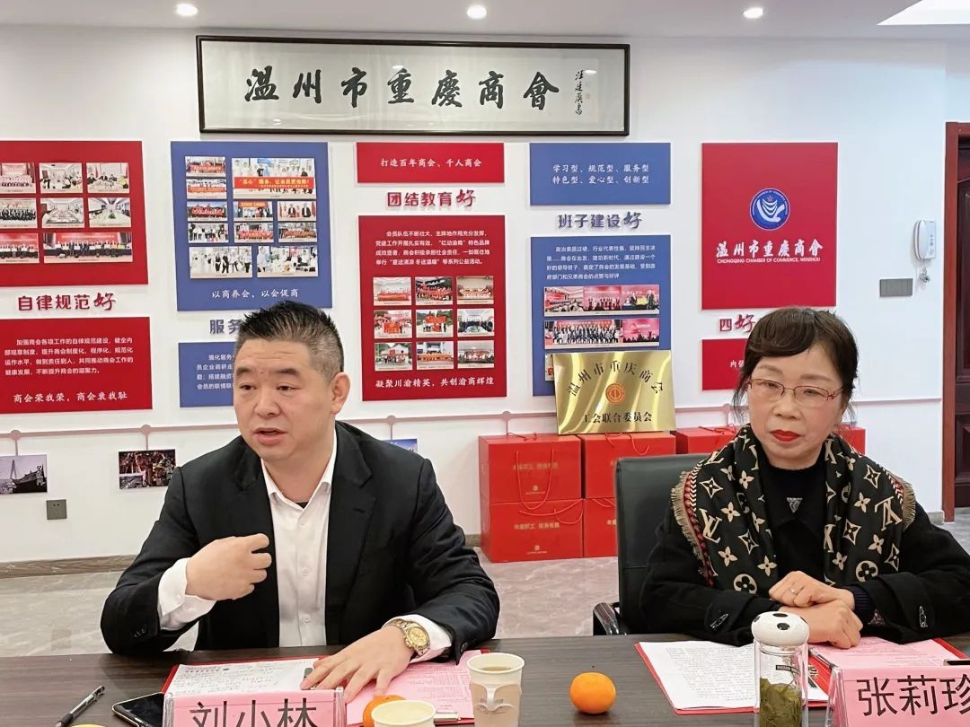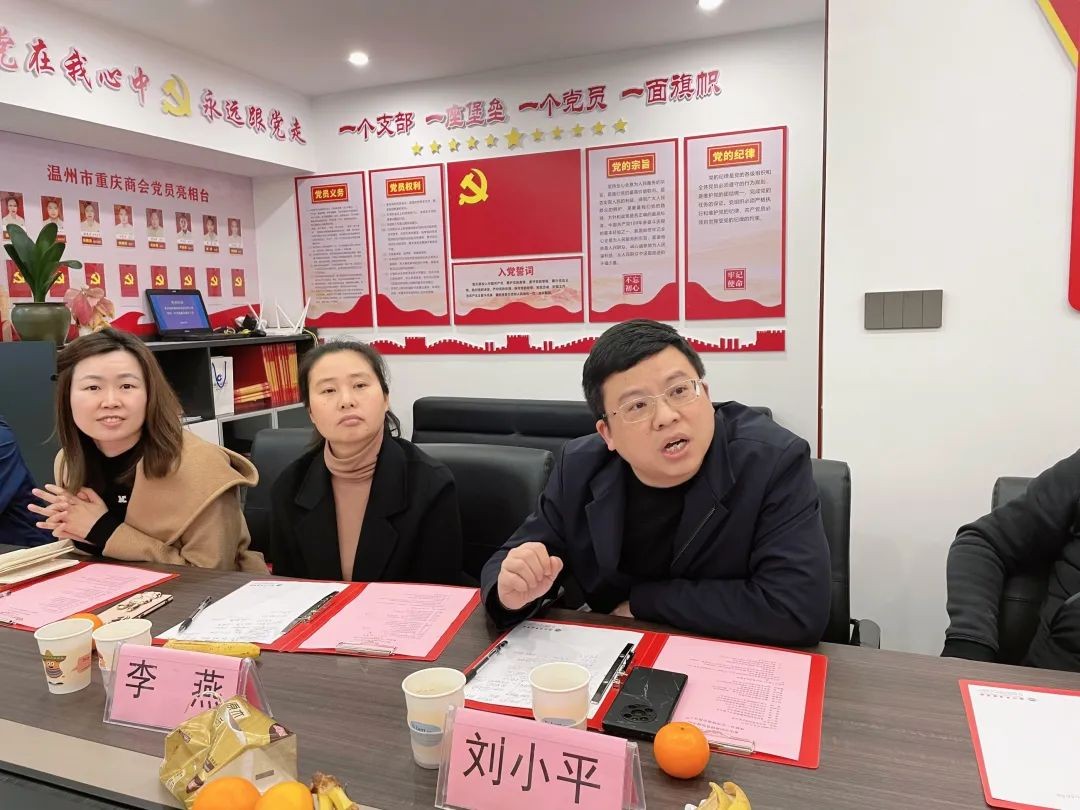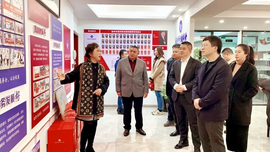 温州市重庆商会党支部书记张莉珍带领来访领导参观了商会领导亮相牌、荣誉墙、党建文化墙,并详细介绍了商会党建、会建工作以及商会获得的荣誉等。随后在商会会议室进行了座谈;座谈会由商会党支部书记张莉珍主持。
