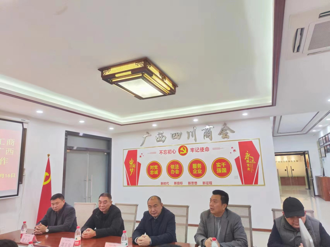 广西四川商会会长郎云燕、党支部书记谭克荣、执行会长兼执行秘书长贾进、监事长周上元、副秘书长曹勇参与了座谈会。