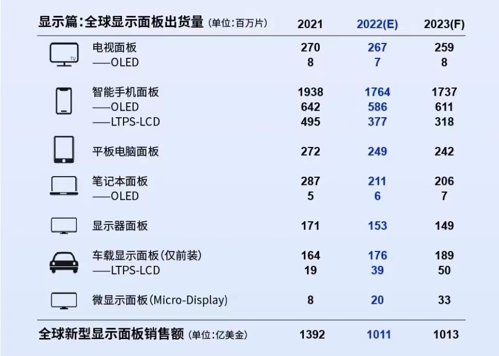 2023年,全球显示应用市场将会出现分化,消费电子需求受到疫情红利消退的影响将进一步萎缩,仅在发达经济体和高端产品市场继续保持一定的支撑,而商用和教育等新兴应用市场的需求还将维持强劲。平均尺寸扩大还将在一定程度上帮助显示器件(面板)厂商去化产能增长的压力。但在供需形势已经发生根本性反转的前提下,2023年全球显示产业下行压力依然存在。