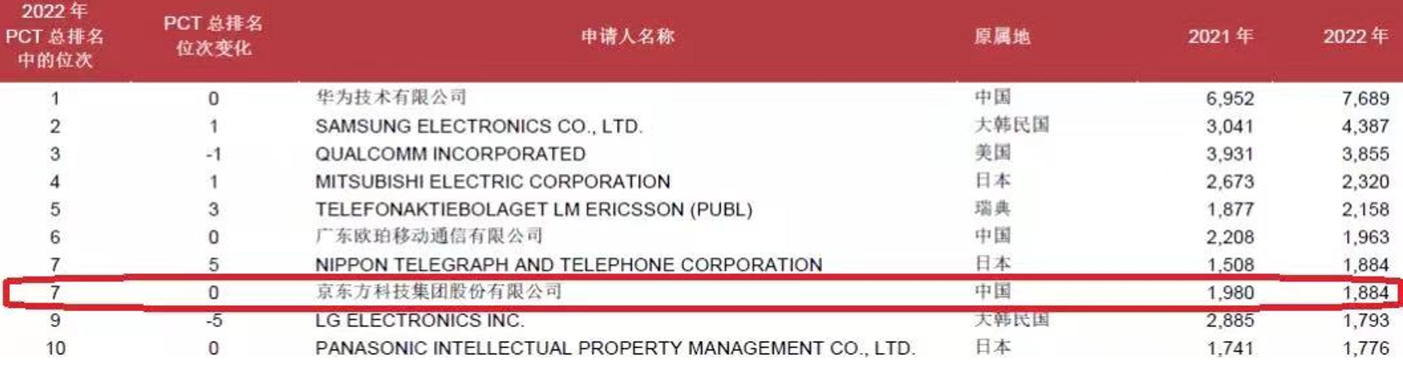 2月28日,世界知识产权组织(WIPO)公布了2022年全球PCT国际专利申请排名,中国国际PCT专利申请量继续保持第一,其中BOE(京东方)以1884件PCT专利申请量位列全球第七,连续7年进入全球PCT专利申请TOP10,以强劲的研发水平和创新实力成为中国科技企业中的创新“翘楚”,同时也预示着其科技创新的全球竞争力和影响力正在加速跃升。