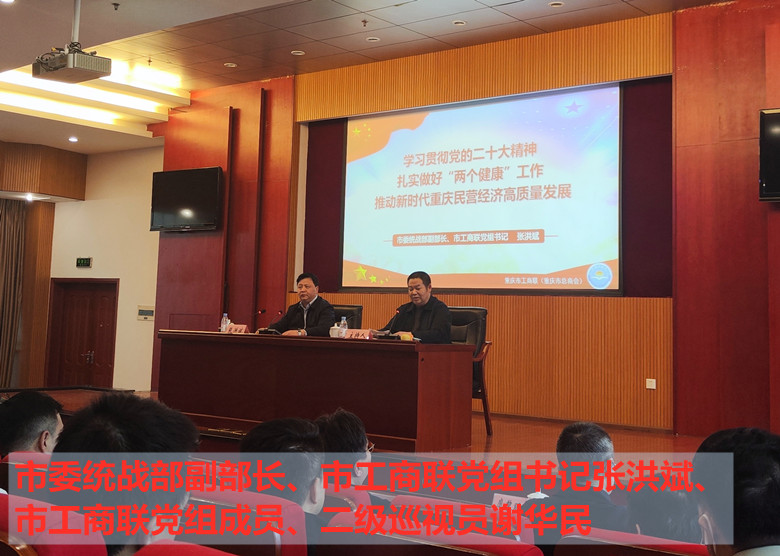 市委统战部副部长、市工商联党组书记张洪斌为与会人员讲授《学习贯彻党的二十大精神 扎实做好“两个健康”工作 推动新时代重庆民营经济高质量发展》为主题的学习内容。一是:从多角度说明了中国式现代化是中国人民实现民主复兴的必然选择,并多方面分析了如何一体学习党的二十大报告和习近平总书记重要讲话精神,以及中国式现代化的丰富内涵和实践要求;二是:学深悟透习近平总书记关于促进民营经济发展的重要论述,确保民营经济统战工作沿着正确的方向前进;三是:认清形势、正视问题,准确把握重庆民营经济在新时代所处的历史方位;四是:唯实争先、善作善成,着力推动重庆民营经济高质量发展。
