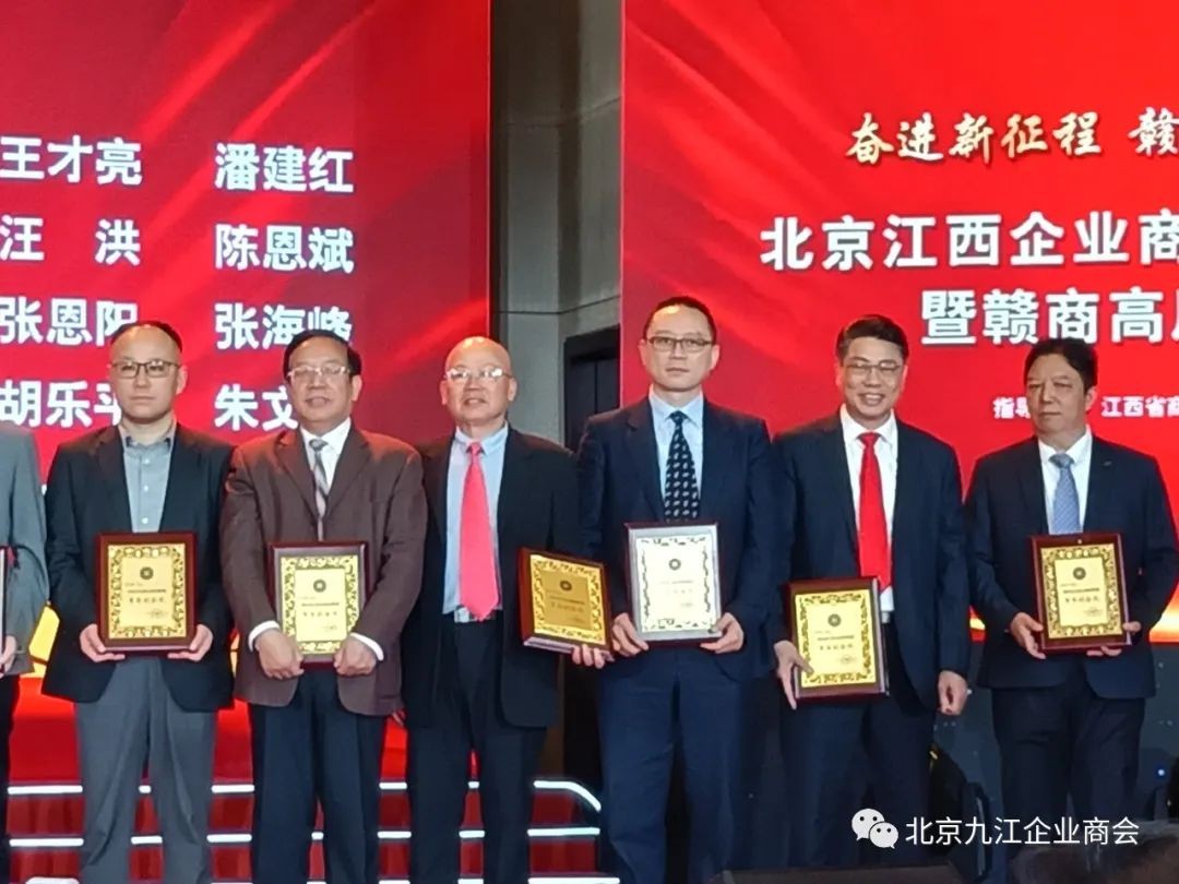 北京九江企业商会会长周子涵(右三)等上台接受北京江西企业商会常务副会长的授牌