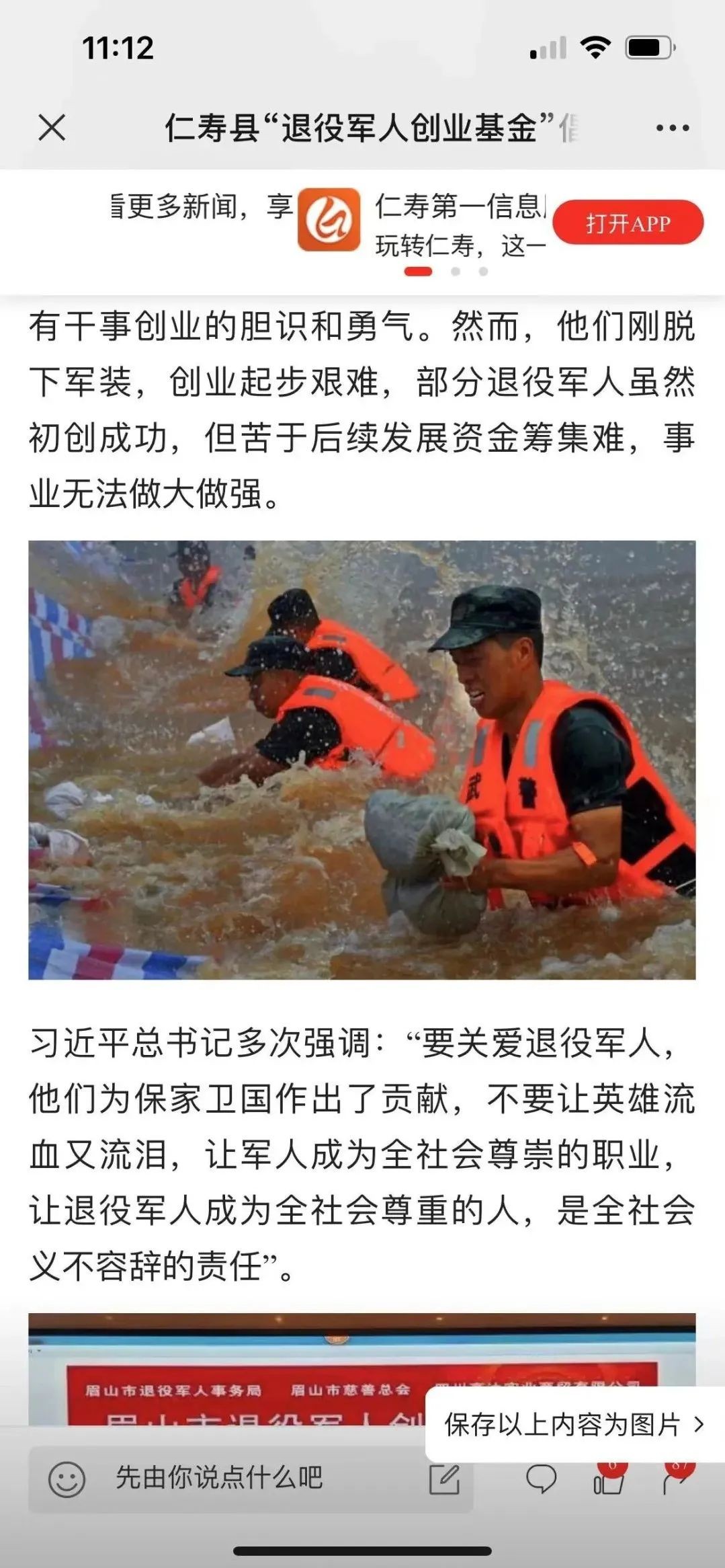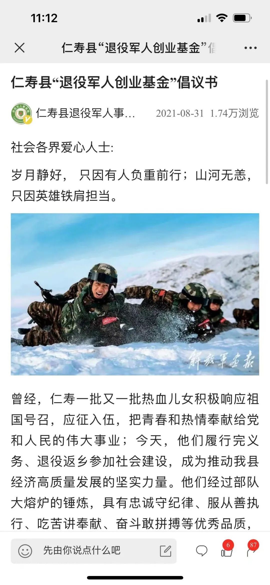 2022年、重庆市仁寿商会、仁寿县驻重庆退役军人服务点收到仁寿县退役军人事务局发布的“退役军人创业基金”倡议书,立即向重庆市仁寿商会会员、仁寿县驻重庆退役军人服务点退役军人发出倡议,广大会员及在渝仁寿籍退役军人积极响应号召,立即行动起来,慷慨解囊,捐款捐物。在重庆疫情如此严重,企业经营非常困难的情况下,仍然慷慨相助,表达对仁寿家乡退役军人事业发展的关爱和支持,对仁寿返乡创业军人的帮助和支持。
