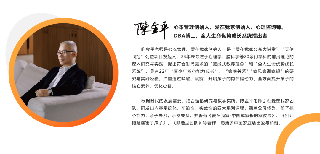 包括《卓越种子-系统思维大师》 、《卓越种子-优势生命力-高/低龄》 、《亲子课程-相约 去远方》、《亲子课程-心智力育成-内在秩序构建》、《父母修为-教养技巧训练营》、《父 母修为-赋能对话训练营》、《亲密关系-钟爱一生的秘密》、《青春期性教育》、《情绪力 育成》、《学习力育成》、《父母必备的心理学》, 以及家庭教育线上平台——赋能中童, 专注于提升父母修为, 融洽亲子、夫妻、家庭关系, 提升孩子的内驱力, 唤醒孩子的优势生 命力, 培育卓越孩子, 构建中国家庭的“爱与和谐”。