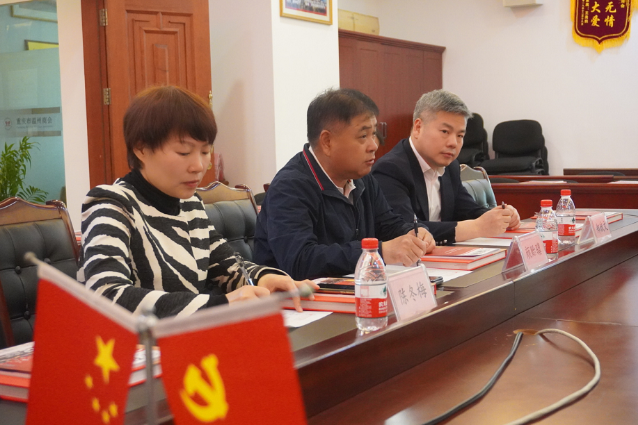 会上,党委书记颜贻骥对杨琳书记一行莅临商会指导工作表示热烈欢迎,他谈到从初次来渝到成立公司,公司地址几经搬迁都仍然选择留在渝中,对渝中区的生活、交通等情况非常了解,表达了对渝中区深厚的感情和浓郁的情怀。从商会成立到发展至今,他就商会会员情况、负责人情况、商会党委、在渝温商党工委工作情况及党员联系管理情况、党建会建融合分别向杨琳书记一行进行了汇报。