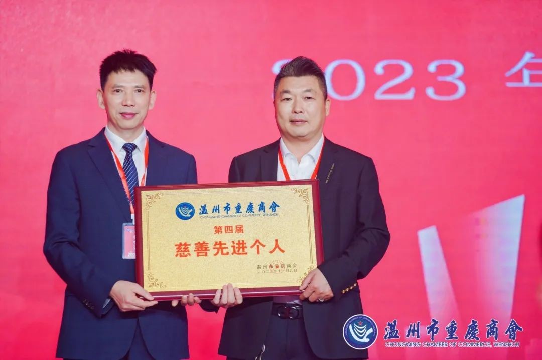 五一劳动奖章获得者,亚运火炬手,商会副会长刘康东为2023年度慈善个人先进奖获得者副会长华永春颁奖。