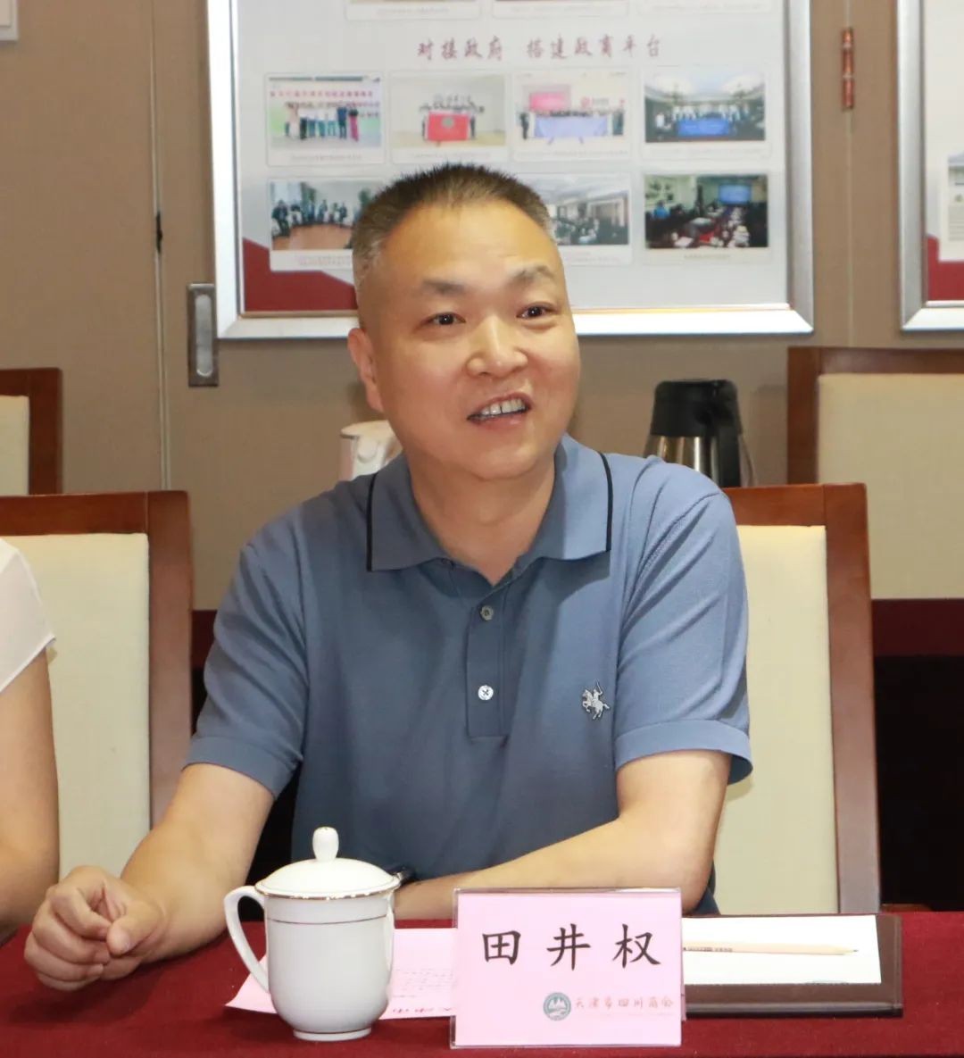 何立渊代表商会致欢迎词,他对田井权会长一行的到来,表示了诚挚的欢迎和衷心的感谢,双方观看了天津市四川商会宣传片。他表示,在津川两地政府的支持下,我会会员企业抱团发展、返乡创业,紧跟形势,努力发展,打造了一支优秀的川商队伍。我会坚持政治引会、发展强会、服务兴会、制度管会的目标,提升商会凝聚力、影响力,树立川商品牌。希望通过此次交流座谈,我会能够与滨渝企联会搭建良好的沟通与交流的平台,为津川两地经济建设做出贡献!