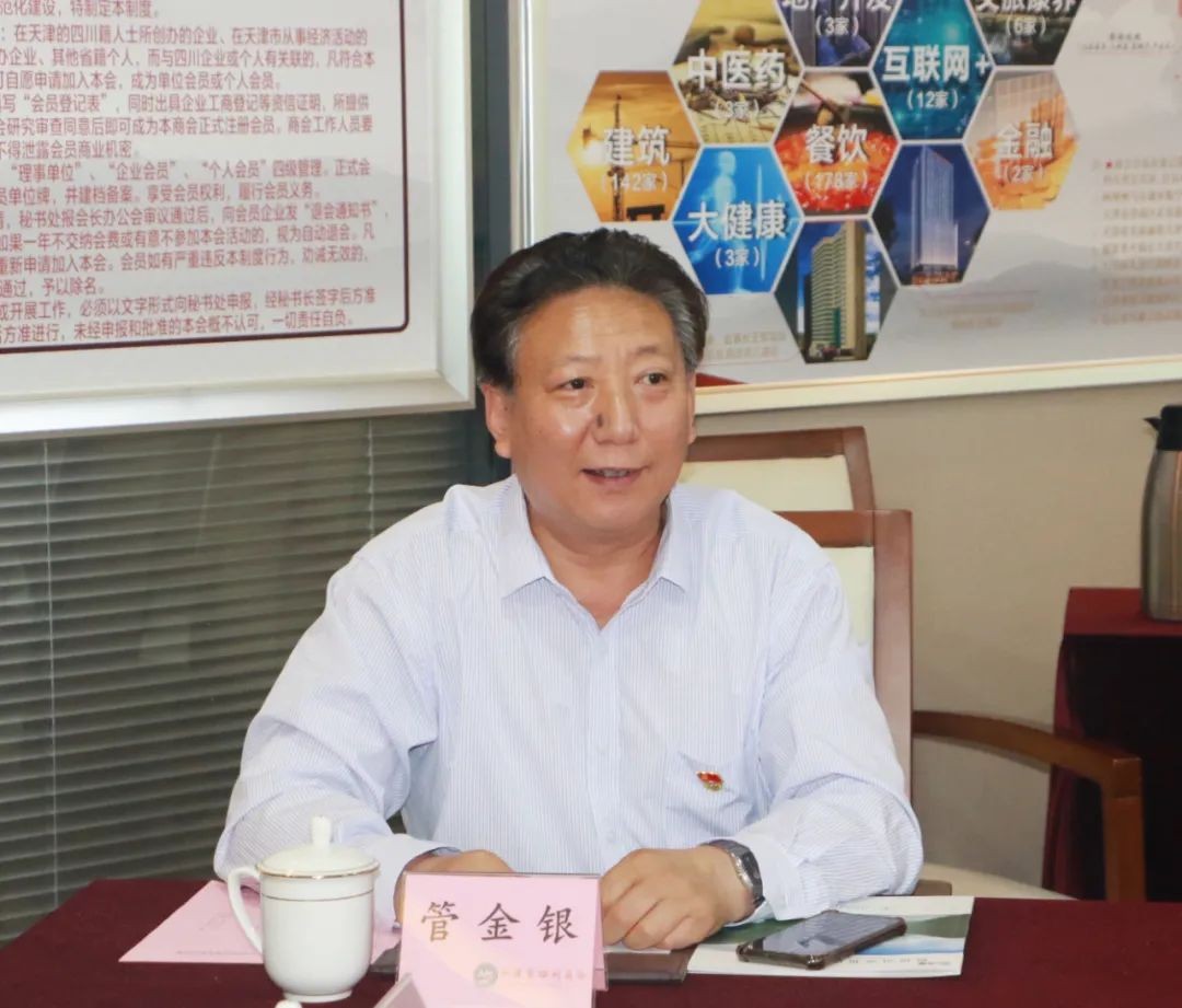 管金银介绍了天津市四川商会的发展现状、发展目标以及党建工作情况。近年来,商会一直以“规范化管理、人性化服务”为目标,秉持“家国情怀、抱团发展、为荣誉而战”的发展理念,带领会员企业开拓进取。今后,商会将加强与家乡政府的联系,也希望家乡政府与企业家之间能够建立相互信任的良好关系,扶持企业成长。我会将做好乐山市金口河区和沙湾区人民政府的招商员、宣传员、服务员、联络员,积极组织会员企业返乡考察项目,推进双方互动交流,为津川两地经济建设贡献绵薄之力!