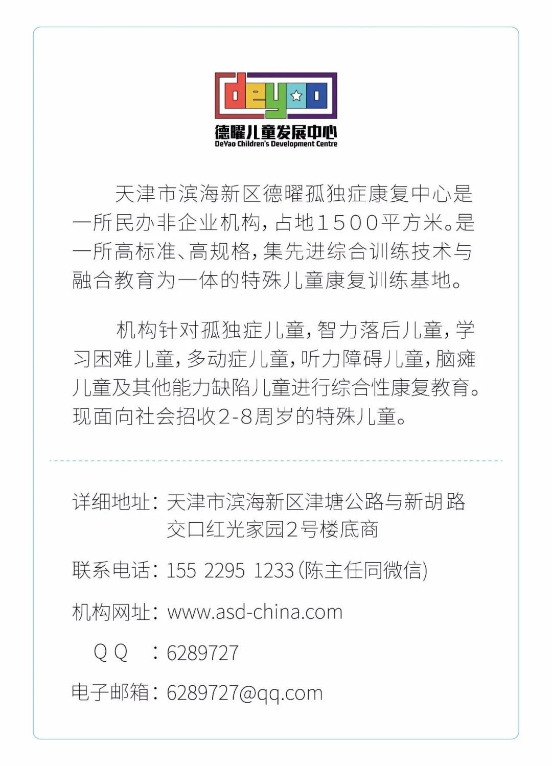 德曜儿童发展中心坐落于滨海新区津塘公路与新胡路交口,占地近1500平米,是一所高标准、高规格,集先进综合训练技术与融合教育为一体的儿童发展中心。中心成立于2019年05月,在天津市滨海新区审批局登记注册,是一所民非性质的康复教育中心。