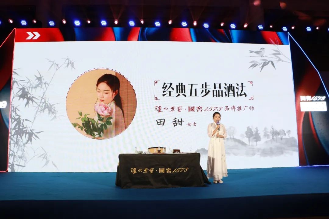历史的沉淀使美酒香浓醇厚,时代的发展让技艺越发精湛。国窖1573推广大使田甜女士引导来宾通过国窖独创的“静、观、闻、品、悟五步品酒法”品评美酒,并为大家进行优美典雅的酒道表演“神龙五式”。展现了中国高端浓香型白酒的独特品鉴方式,赢得满堂喝彩。