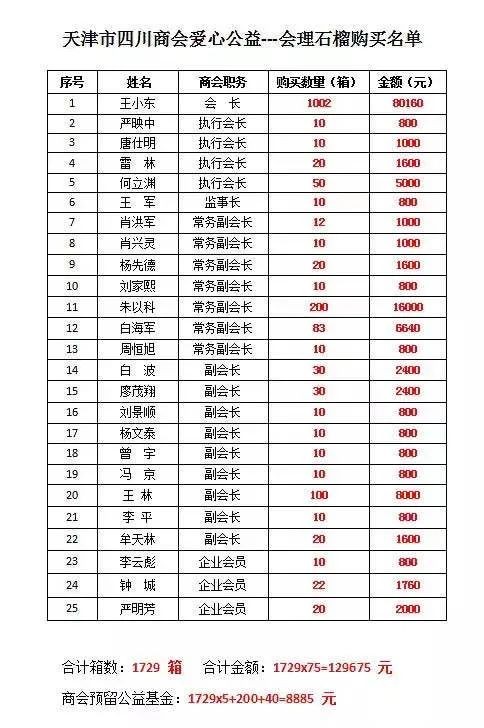 2019年12月29日,天津市四川商会利用凉山州会理石榴筹集的10205元公益基金成立“光彩事业专项资金”。商会会长王小东与天津市光彩事业促进会主任李雷进行了交接仪式,用实际行动践行企业家的社会责任。