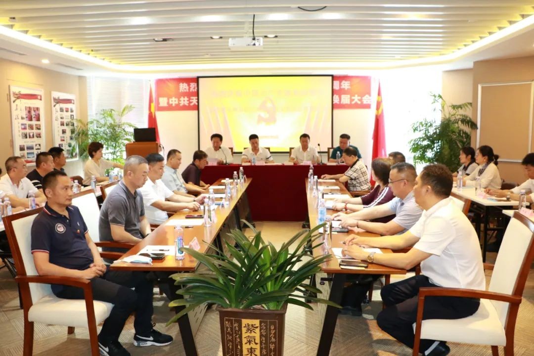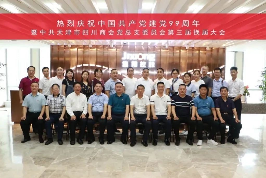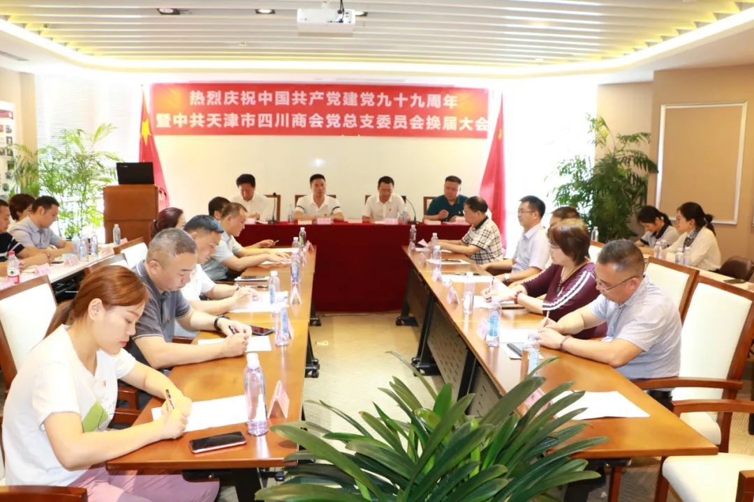 2020年7月5日下午,热烈庆祝中国共产党成立99周年暨中共天津市四川商会党总支委员会第三届换届大会在商会会议室隆重举行。参加会议的有中共天津市四川商会党总支书记严映中,川籍农民工流动党支部书记肖洪军以及全体党员出席大会;特邀嘉宾天津市四川商会会长王小东,执行会长兼秘书长、三季度值班会长何立渊,执行会长雷林,监事长王军,常务副会长、7月值班会长朱以科等商会领导列席会议。