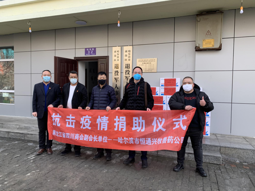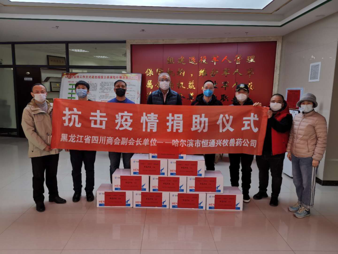3月20日、3月25日,黑龙江省四川商会副会长单位哈尔滨恒通兴牧兽药销售公司从四川总公司空运到哈尔滨30件消毒酒精,通过哈尔滨市南岗区退役军人事务局和道里区退役军人事务局向冰城抗疫一线的“老兵”们定向捐助。