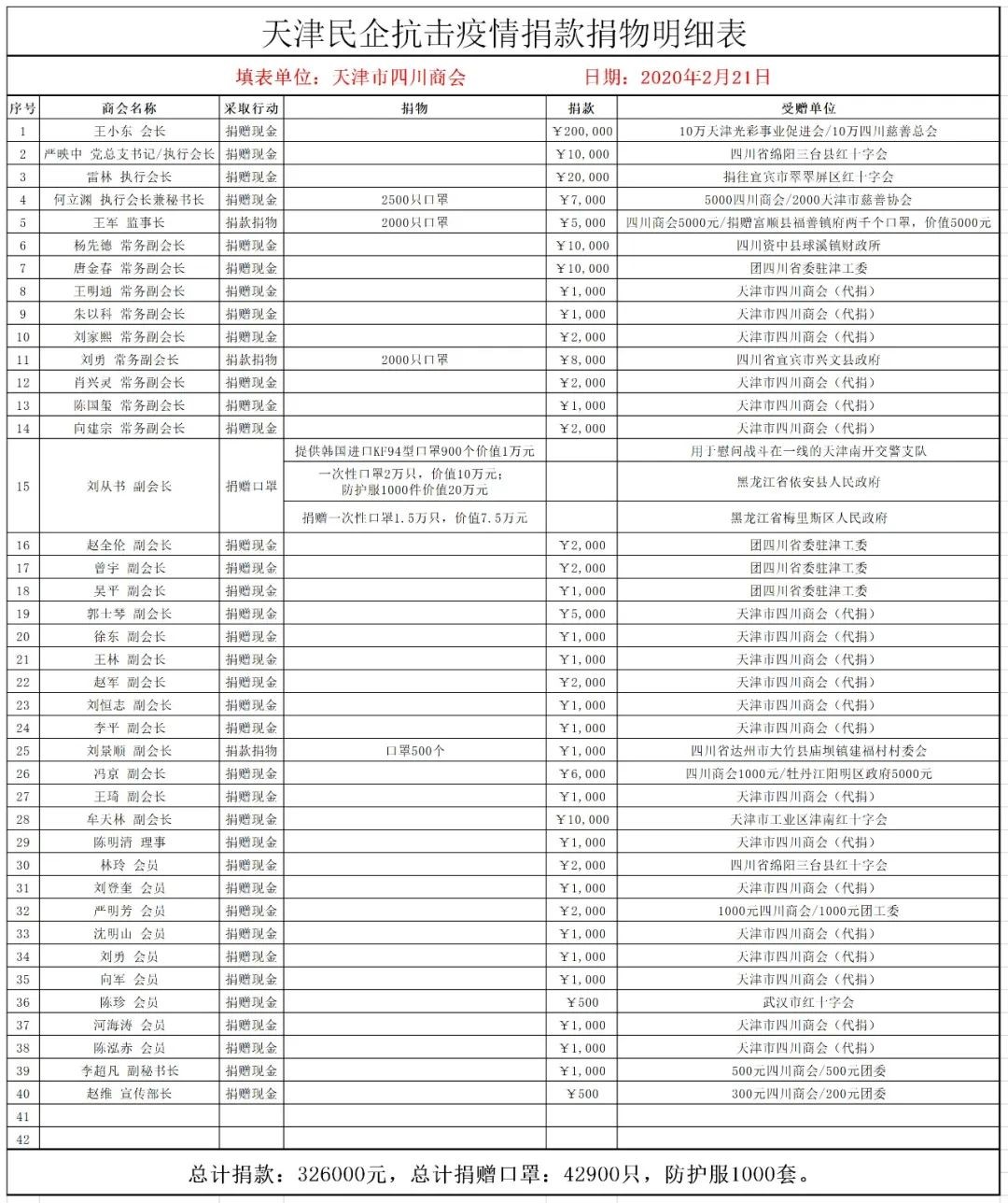 1月29日,经商会领导班子决议,商会发布关于做好疫情防控工作的通知,成立疫情防控工作应急领导小组,积极做好疫情防疫工作。2月6日,发起“施以援手,助力武汉”天津市四川商会向武汉疫区捐款倡议书,商会会长王小东发扬企业家精神带头捐款20万元,并号召广大会员企业捐款捐物,爱心捐助驰援疫区。会员企业积极积极捐款捐物,千方百计寻找货源,已于2月中旬向社会各界捐赠善款326000元,口罩42900只,防护服1000套,合计捐款捐物总价值近75万元。3月1日,商会全体党员也积极响应捐款号召,捐款金额共计31600元,用实际行动践行初心使命、助力疫情防控。
