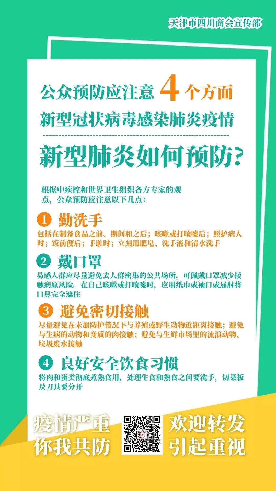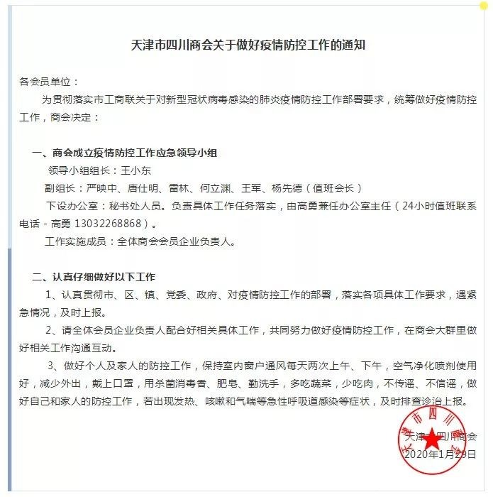 天津市四川商会把疫情防控工作作为当前工作的重中之重,商会迅速成立疫情防控工作应急领导小组,启动疫情紧急应对机制,第一时间发布《天津市四川商会关于做好疫情防控工作的通知》,全面号召会员企业坚决响应党中央、国务院的决策部署,广泛动员商会各会员企业投身疫情防控这场看不见硝烟的战争。