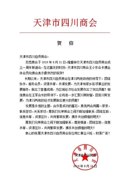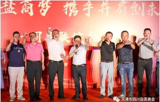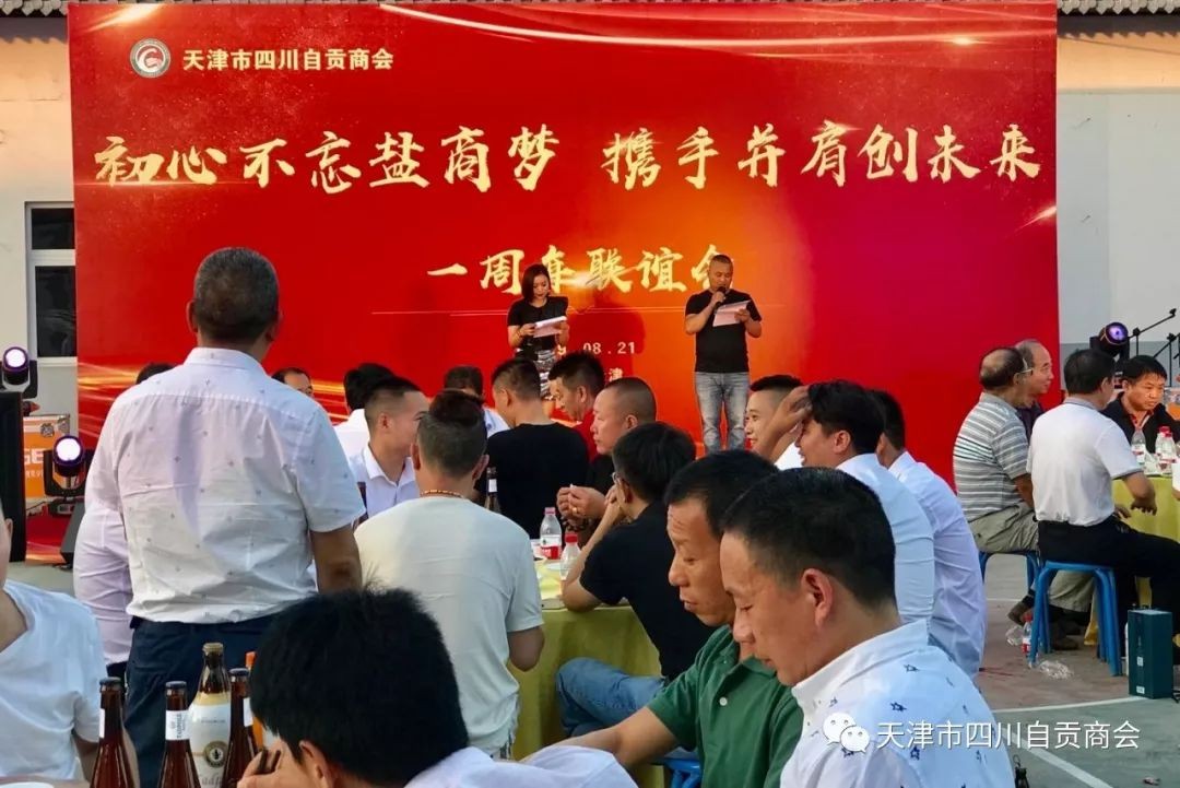 2019年8月21日晚,天津市四川自贡商会成立一周年联谊会隆重举行,到场的嘉宾有:天津地质研究院原院长刘道荣,天津市重庆商会顾问伍前发、会长黄启波、党支部书记刘东福、执行秘书长汤尚罗,天津市企业联合创业促进会执行会长肖兴灵,天津市滨海新区滨渝企业联合会秘书长李洪;天津市四川商会顾问董方林,党总支书记、执行会长严映中,执行会长雷林,执行会长兼秘书长何立渊,常务副会长白海军,陈国玺,刘家熙,专职秘书长高勇;天津市四川自贡商会顾问张帆、唐军;共青团四川省委驻津工委副书记赵全伦、宣传部长李超凡,中银富凳银行行长董长虹等参加联谊会。