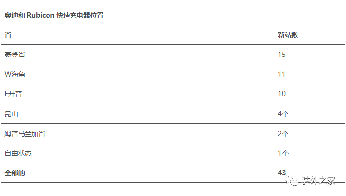 奥迪南非和Rubicon新装EV充电桩分布情况如下表所示。