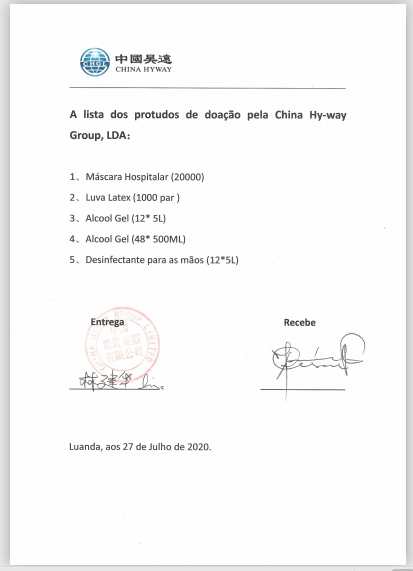 Under this background, on July 27, 2020, Lei Jun-CA Construction, Limited, as branch of China Hyway Group Limited in Angola, under the leadership of Deputy General Manager Lin Jianhua, donated Ministry of Transport of Angola 20,000 medical masks and some disposable gloves, disposable disinfecting gel, sanitizer and other anti-epidemic materials with a total value of more than ten million kwanzas.