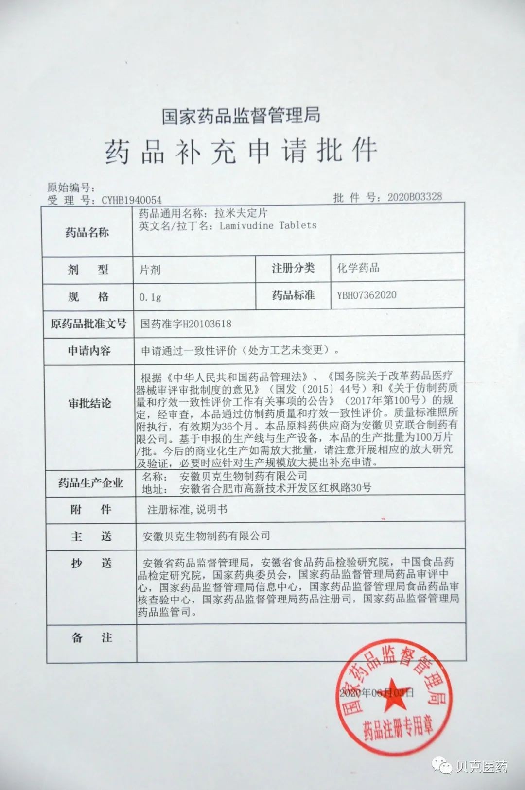 安徽贝克治疗慢性乙型肝炎HBV适应症“拉米夫定片(规格0.1g)”产品顺利通过国家“仿制药质量与疗效一致性评价”,成为贝克公司第五个通过“一致性评价”产品,同时也成为了该产品全国通过“仿制药一致性评价”的第二家药企。