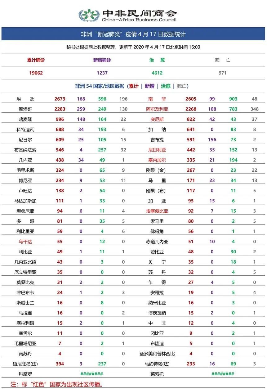 截至北京时间4月17日18:00,非洲累计新冠病毒确诊病例19062例,死亡971例,治愈4612例。