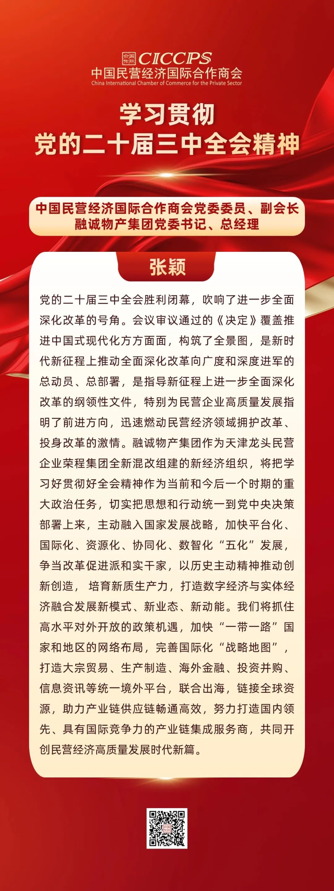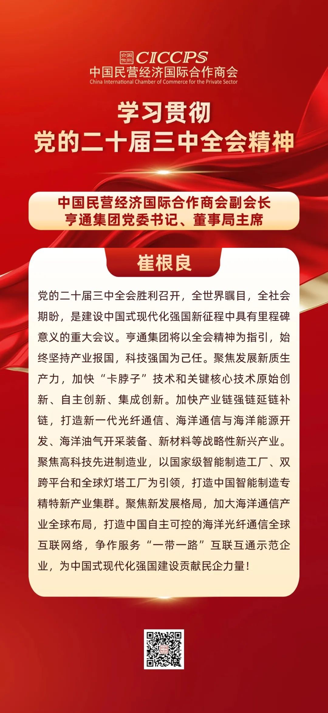 7月15日至18日,中国共产党第二十届中央委员会第三次全体会议在北京召开。审议通过《中共中央关于进一步全面深化改革、推进中国式现代化的决定》,再次传递出“改革不停顿、开放不止步”的鲜明信号,吹响了新起点上进一步全面深化改革的号角。中国民营经济国际合作商会党委第一时间组织号召会领导班子认真学习贯彻会议精神,大家纷纷表示,要把思想和行动统一到党中央的决策部署上来,坚定不移沿着党中央指引的正确方向奋进,不断服务促进民营经济发展壮大,为中国式现代化建设聚力赋能,作出商会应有贡献。