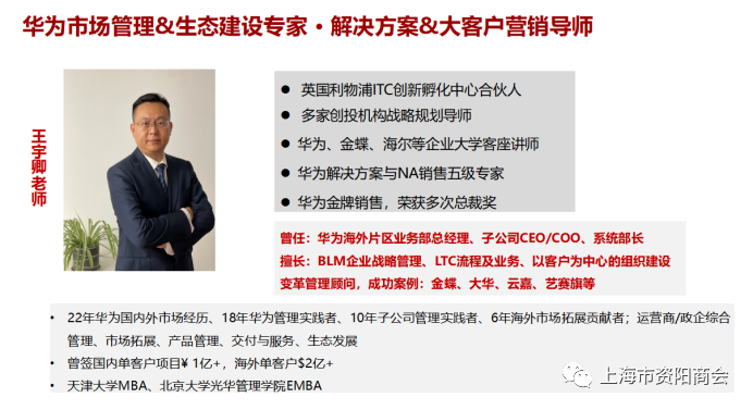 执行会长、秘书长李毅代表上海市资阳商会对两位老师放弃周末休息时间来给商会会员们培训表示衷心的感谢,对东方龙队会务组人员精心组织这次活动表示赞赏。他表示2022年的疫情虽然给商会会员企业的生产、生活都带来了严重的影响,绝大部分企业的发展都带来了极大的不确定因素,但困难是暂时的,希望大家迎难而上,练好内功、学习成功企业解决危机的能力。2022年是商会商务之年,要加强商会内循环商业合作,促进商会会员企业与外部商会商务交流,通过不断的学习交流加深印象、互相了解、获取商机、从而达到资源互助、合作共赢。王宇卿老师分享了华为企业文化及核心价值观形成历程,就华为1988-2022.34年间从混沌到“走出混沌”从战国到帝国的发展历程、对华为从产品、人才、管理、激励机制、股权设置、应对危机等作了详细讲解。