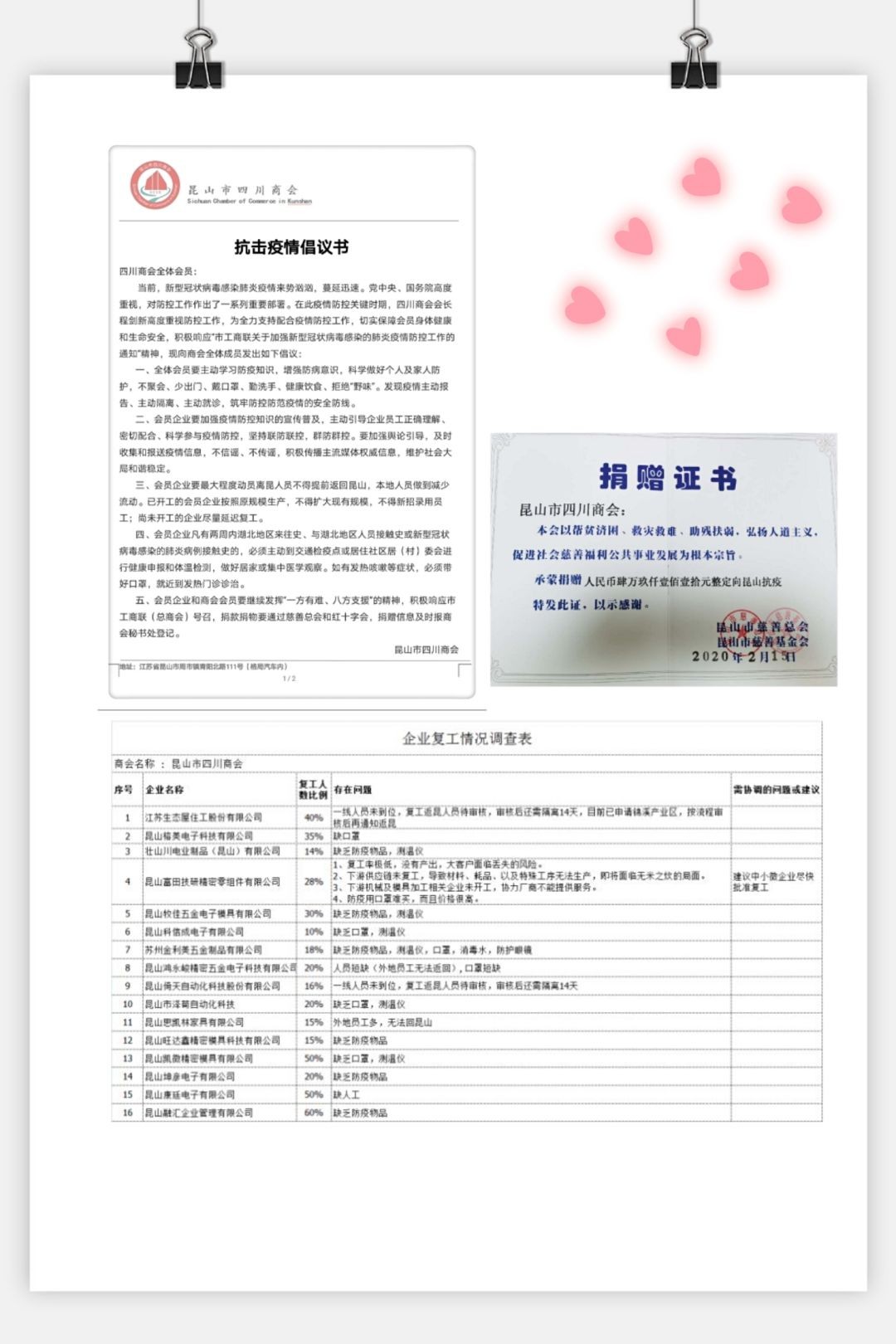 ▲2月10日以来,随着昆山的企业陆续复工复产,四川商会也积极配合会员企业处理申请复工事宜。截止2月27日,商会会员企业已复工16家。