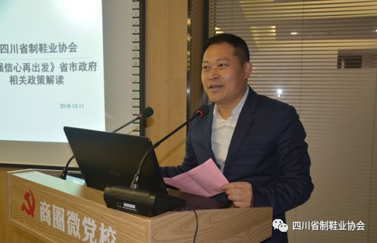 会上、四川省鞋业协会监事长王中良首先做了开场致辞。四川省经信厅轻纺处徐平均副处长解读了《中共四川省委 四川人民政府 关于促进民营健康发展的意见》。前四川省工商联副主席钱卫东从《促进民营经济健康发展的几点思考》解读省市政府对民营企业政策支持,并用案例讲述了民营企业如何另辟道路在市场低迷的情况下做大做强。