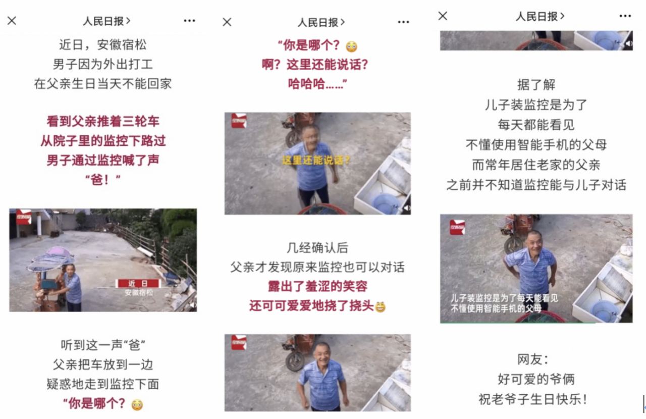 近日,《人民日报》官微发布了一篇视频推文,视频中的父亲在路过家院监控时,发现“摄像头”在跟他说话,疑惑的直挠头,几经确认后,老父亲才发现是远在千里之外的儿子通过监控与他对话,祝他生日快乐。