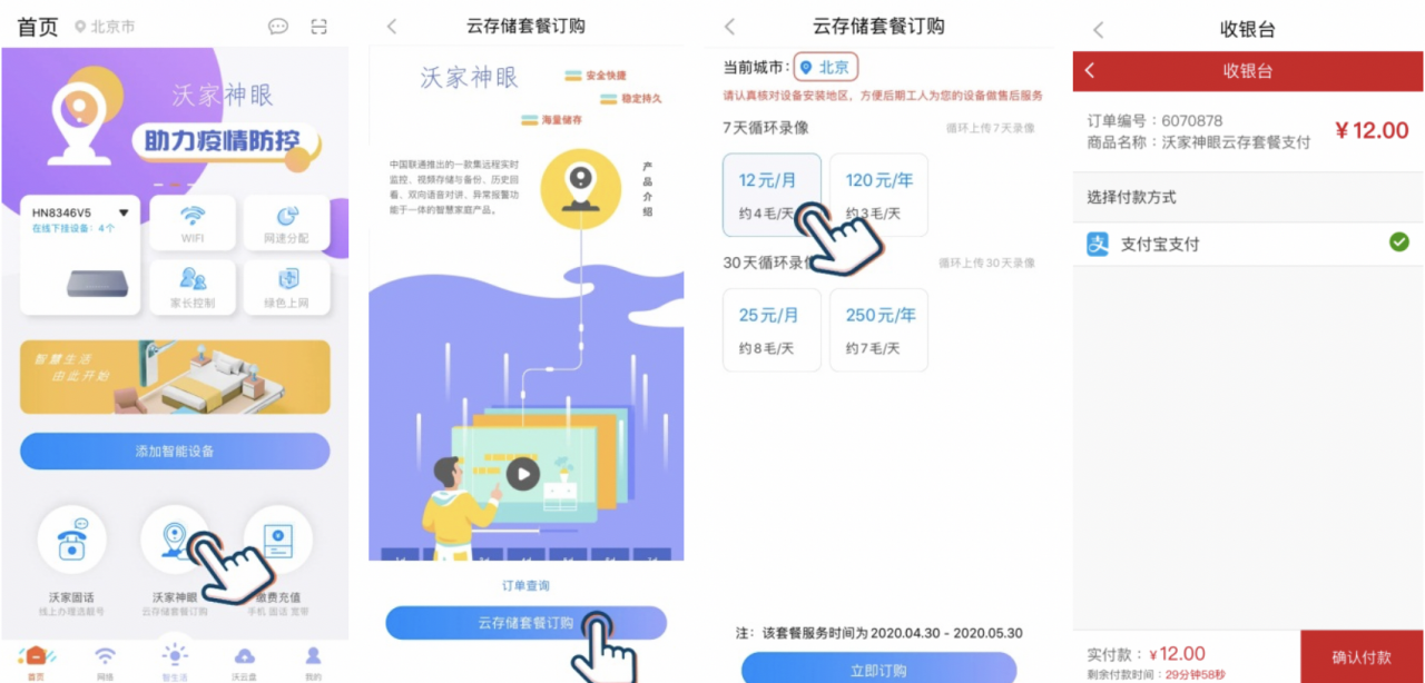 云存储业务则可通过智慧沃家APP—沃家神眼云存储套餐订购,进入页面后选择当前城市及套餐类型,通过支付宝等线上方式支付即可。值得一提的是,即日起至12月31日,在智慧沃家APP首次激活的联通行业版智能摄像头终端,即可免费体验3个月的“7天云回看”服务,用户可通过智慧沃家APP实现对摄像头多种功能的设置与使用,安享联通“沃家神眼”带来的科技安全感。