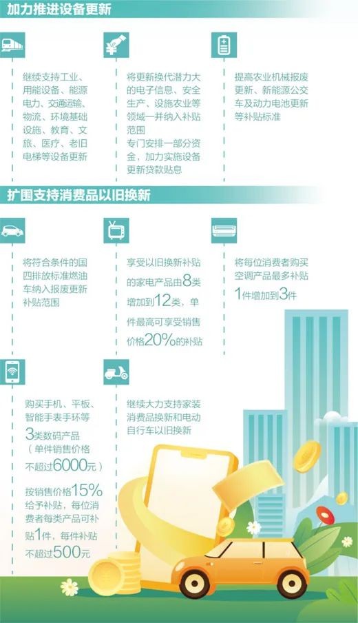 加力推进设备更新。继续支持工业、用能设备、能源电力、交通运输、物流、环境基础设施、教育、文旅、医疗、老旧电梯等设备更新,进一步将更新换代潜力大的电子信息、安全生产、设施农业等领域一并纳入补贴范围。专门安排一部分资金,加力实施设备更新贷款贴息,放大资金撬动效应,降低经营主体设备更新融资成本。进一步提高农业机械报废更新、新能源公交车及动力电池更新等补贴标准。