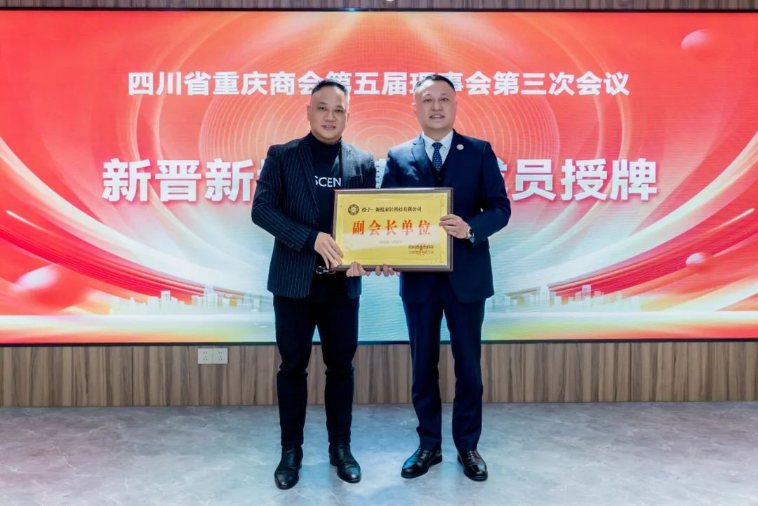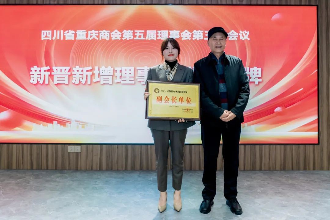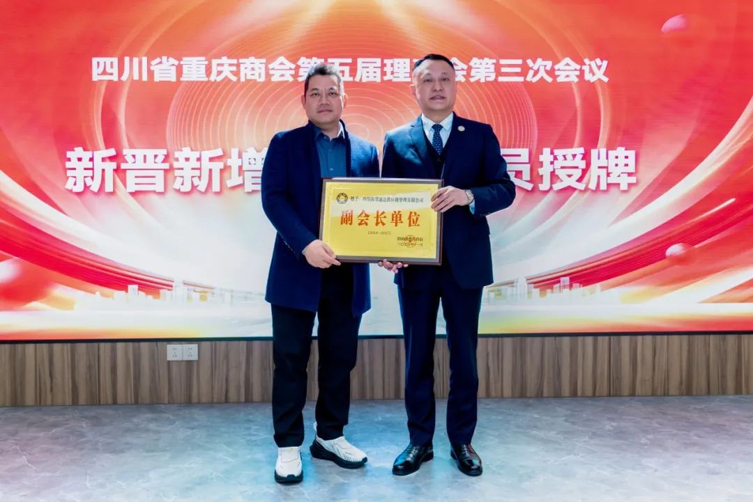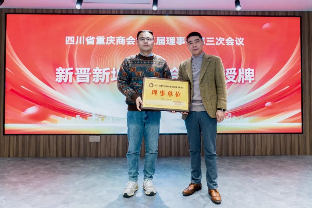 第四季度商会新增、新晋理事会成员有副会长成都宏展电脑科技有限公司总经理刘雨、成都创亿嘉科技有限公司执行总裁唐寒鸣、新悦家居科技有限公司董事总经理朱玉阳、成都喜斯徕智能科技有限公司总经理刘海连,理事成都星空联盟影视文化传媒有限公司总经理李在新。会上,这批新增、新晋理事会成员分别就各自企业的基本情况、主营业务和发展规划进行了简要介绍。他们表示,商会作为在川渝商共叙乡情、共同学习、共同成长的家园,我们要紧密团结在以吕状文会长为代表的理事会周围,秉持开放包容、合作共赢的理念,办好企业、当好表率,为把商会办成信息互通、资源共享、共谋发展的坚实平台,而不断添砖加瓦贡献力量。吕状文、杨和平、廖义全分别为新增、新晋商会副会长、理事授牌。