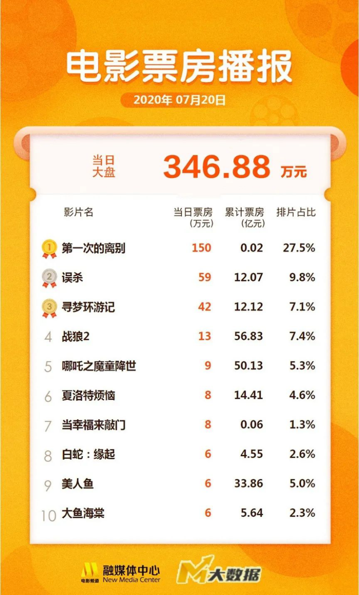 由峨影集团、大象伙伴影业、芒果TV、腾讯影业等联合出品的电影《第一次的离别》,在国家宣布低风险地区部分影院可以逐步恢复营业之前就官宣会在影业复工首日上映。7月20日,全国影院正式复业,当日全国电影总票房346.88万元,电影《第一次的离别》首映当日票房150万元。