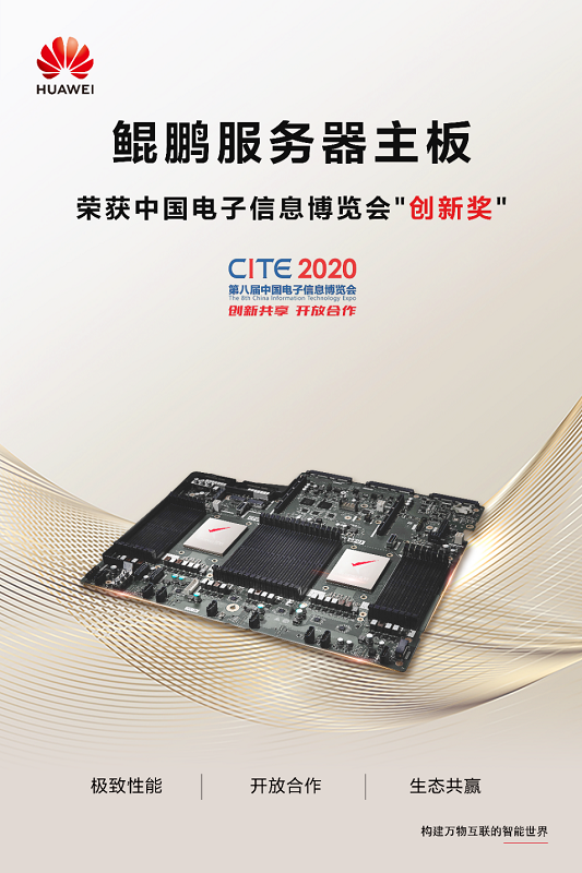 [中国,深圳,2020年8月18日] 近日,在第八届中国电子信息博览会(China Informatica Technology Expo;英文简称“CITE”)上,华为鲲鹏服务器主板凭借其高性能,高可靠的特点及开放的生态,荣获中国电子信息博览会“创新奖”。