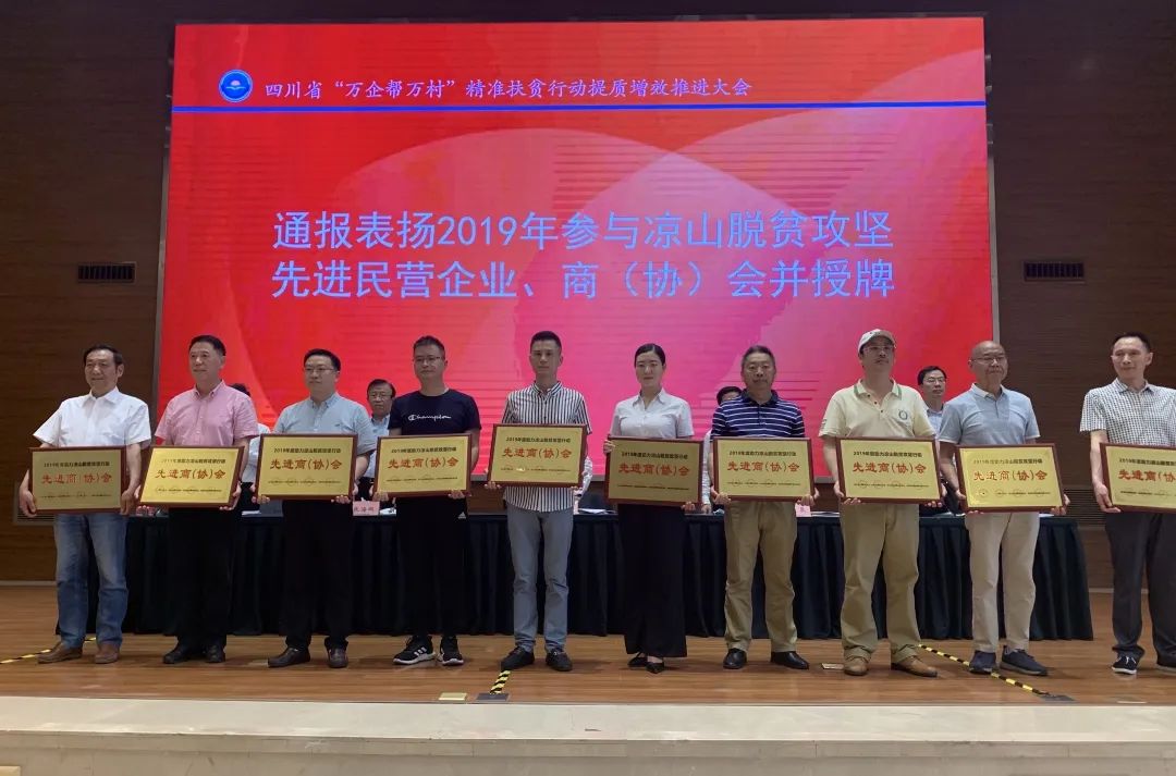 会上,四川省工商业联合会、四川省扶贫开发局、四川省光彩事业促进会、中国农业发展银行四川省分行决定,对2019 年度助力凉山脱贫攻坚中表现优异的四川省建筑业商会等50 家商(协)会和四川铁骑力士集团等101 家民营企业进行了通报表扬并授牌。四川省重庆商会名列其中,商会秘书处负责人高玄波上台接牌。高玄波表示,商会此次被表扬为“2019年度助力凉山脱贫攻坚行动先进商(协)会”,既是对四川省重庆商会参与“万企帮万村”精准扶贫行动的肯定,更是一种鞭策,四川省重庆商会一定珍惜荣誉、再接再厉,认真学习先进单位的好经验、好做法,进一步增强责任感和使命感,为全面打赢凉山脱贫攻坚战、投身“乡村振兴”“农业农村现代化”建设不懈奋斗。