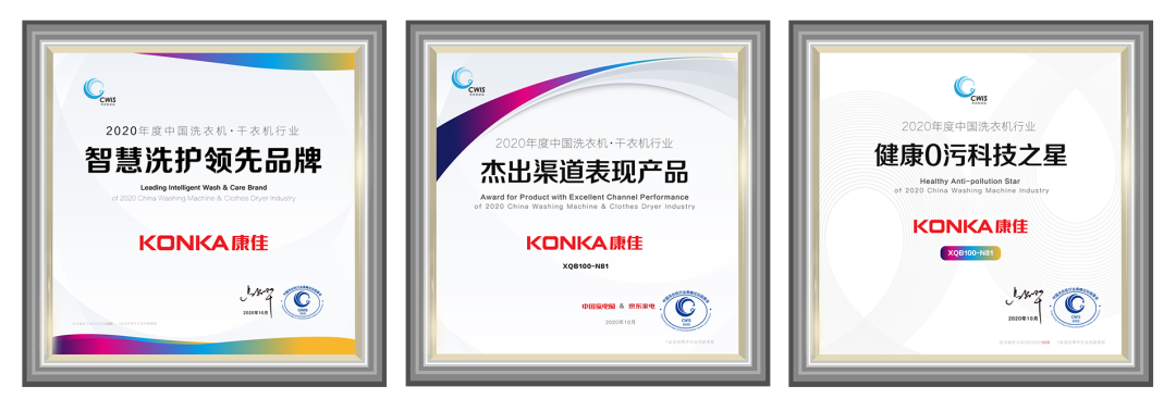 旗下主打智慧0污的洗衣机 XQB100-N81 更是以简约的外观设计和健康智能洗涤科技赢得了业内专家及消费者的好评,荣膺“2020年度中国洗衣机·干衣机行业健康0污科技之星”及“2020年度中国洗衣机·干衣机行业杰出渠道表现产品奖” 两项大奖。这既是对康佳洗衣机行业地位的高度认可,更是对康佳洗衣机推动行业创新发展所做努力和成果的充分肯定。