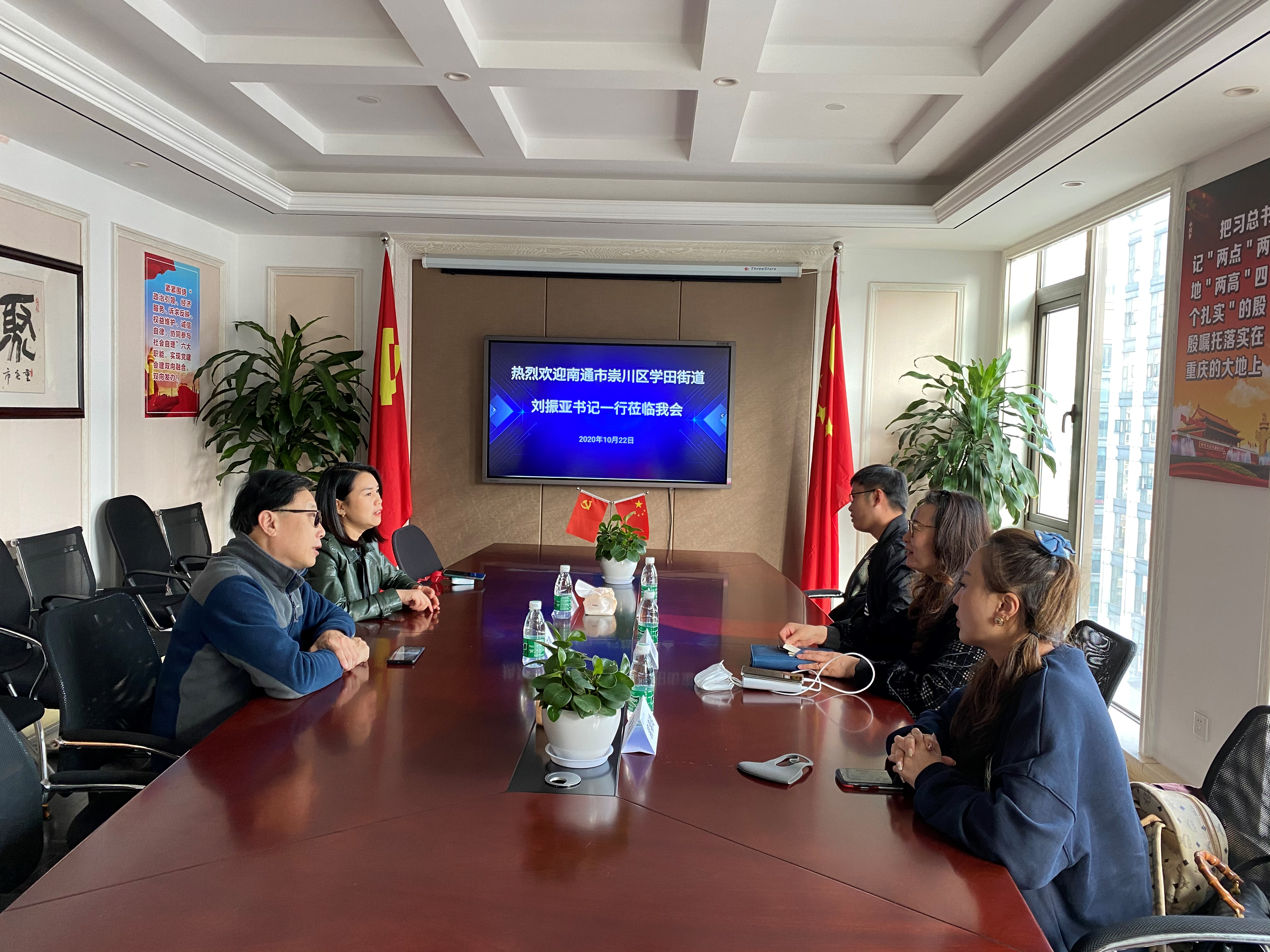 2020年10月22日下午,江苏省南通市崇川区学田街道党工委副书记、办事处主任刘振亚,学田街道财政所所长裴浠玲,学田投资服务局副局长成飞莅临重庆市上海商会,我会秘书长姚庆伟、会员企业--重庆洺沅国际贸易有限公司总经理龙均热情接待并座谈交流。