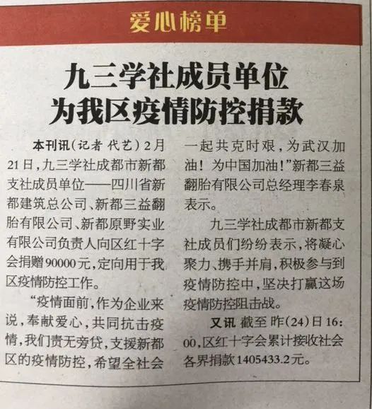 杨和平董事长用实际行动帮助北辰批发市场的商家坚定信心谋发展的同时,2月21日,他再次挺身而出,与新都区两位民营企业家向区红十字会捐赠9万元,购买了一台急救专用工作车定向捐赠给新都区疫控中心,支持新都区的一线抗疫工作。他们的这一善举得到九三学社四川省委、新都区统战部的表扬,媒体对此进行了积极宣扬。杨和平董事长作为九三学社成都市新都支社成员,为学社成员和民主党派人士树立了榜样,必将号召更多的爱心人士积极参与到“防疫情、促复产”中,为实现双胜利贡献力量。