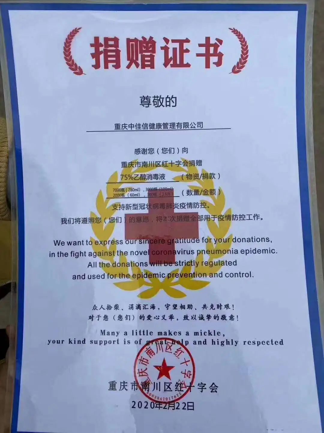 争分夺秒,使命必达。为积极贯彻落实中央“一省包一市”全力支持湖北省疫情防控工作的统一部署和重庆市工商联《关于认真做好对口支援孝感市新冠肺炎防治工作的通知》精神,2月22日上午,四川省重庆商会南川分会副会长单位中佳信集团向湖北省孝感市捐赠的总价值160余万元美丽直通车、粉蓝世界75%乙醇消毒液等抗疫物资装载完毕,向着战“疫”的核心战场湖北驶去,另外公司还向重庆市南川区捐赠了价值40万元的物资用于当地防控抗疫工作。值得称赞的是,中佳信集团此次捐赠的200余万元防控物资,是在公司虽具备生产条件但尚未正式投产的情况下,面对疫区防疫物资的缺乏,在南川区各级政府部门、中医药园区开启的绿色通道下,南川分会副会长、中佳信集团董事长梁正强当机立断按下响应“快捷键”,于2月10日提前启动生产,仅仅11天便紧急生产了美丽直通车、粉蓝世界等用于捐赠的消毒物资。在捐赠仪式上,中佳信集团董事长梁正强表示,疫情面前我们要同舟共济,在疫情蔓延的关键时刻,我们也理应挺身而出,贡献企业的一份力量,帮助政府和人民早日战胜疫情,打赢这场没有硝烟的防控阻击战。前方有医生护士们在跟病毒作斗争,中佳信集团则在他们背后做最坚强的后盾,200万元物资只是开始,只要疫情不结束,中佳信集团的驰援物资将一直准备着。出席捐赠仪式有重庆慈善总会、重庆市南川区红十字会、南川区卫健委、重庆市中医药产业园区管委会等政府各级相关领导。出席的媒体有新华社、重庆晚报、南川日报、南川电视台等。