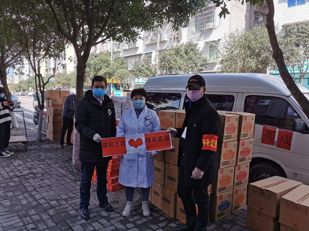 众志成城,携手抗疫。成都市万州联合商会党委书记姜天华获知武汉各大医院空气净化消毒设备紧缺告急,便率领天田医疗电器科技公司员工开足马力,加班加点奋战在生产一线。从1月21日起,生产1000多台空气净化消毒机及时运往武汉和全国各省,为各大医院手术室和危重病房解燃眉之急,受到了当地党委、政府的赞誉。2月16日,成都市万州联合商会委托商会常务理事汪维富等组织采购了48箱饼干、60箱面包和蛋糕、75箱双汇火腿肠、113箱八宝粥等生活物资,送往万州区周家坝第一人民医院。该院院长杨隆奎对成都万商心系家乡、无私奉献、携手抗疫的爱心善举表示衷心感谢。