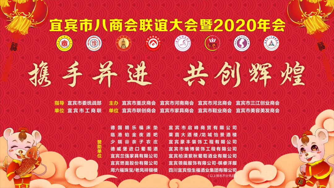 凯歌辞旧岁,瑞鼠迎新春。2019年12月26日,宜宾市八商会联谊大会暨2020年会成功举办。本次年会由宜宾市重庆商会、宜宾市河南商会、宜宾市河北商会、宜宾市三江创业商会、宜宾市联创商会、宜宾市家具商会、宜宾市鞋业商会、宜宾市美容美发商会八家商会共同举办,是宜宾首次最大规模的商会联谊活动。