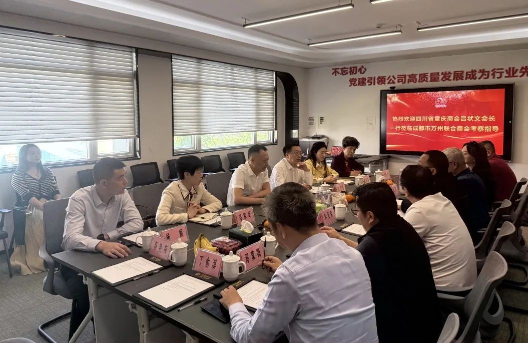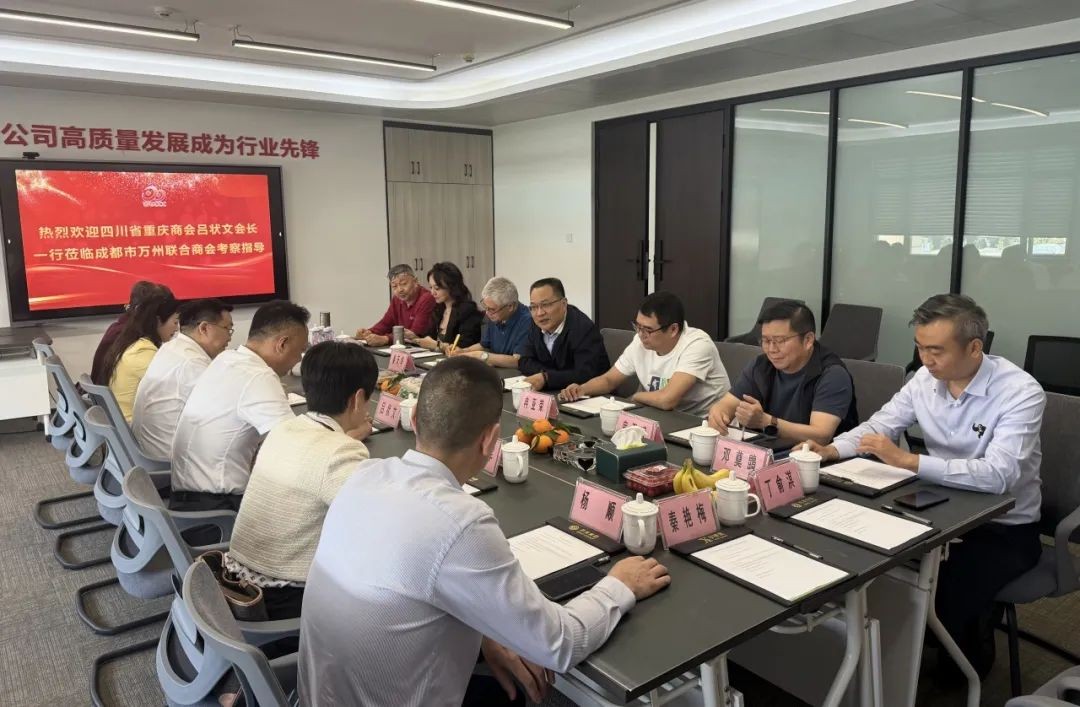 4月24日,四川省重庆商会党委书记、会长吕状文带领秘书长高玄波、副秘书长邓军军,兼职副秘书长李忠琼、傅丽莉等一行赴成都市万州联合商会(以下简称“万州商会”)走访交流。万州商会会长何光明携常务副会长、秘书长冉亚荣,商会党委书记、常务副会长姜天华,常务副会长房召凌、邓奠鵾,副会长邓威、解岚和副秘书长陈怡羽进行了热情接待。双方围绕赓续友谊聚合力、携手并进谱新篇进行了深入友好的座谈交流。座谈会由冉亚荣主持。