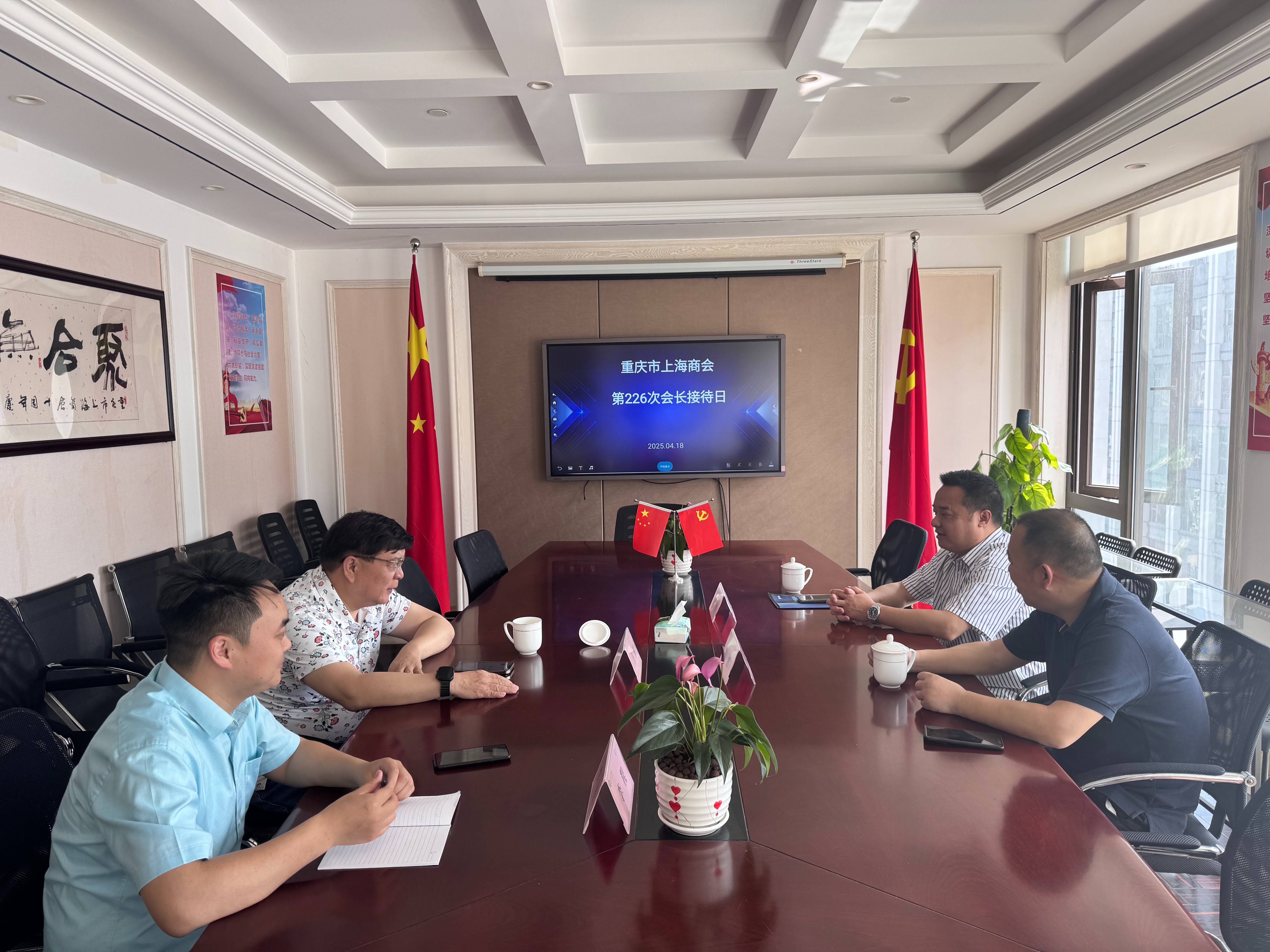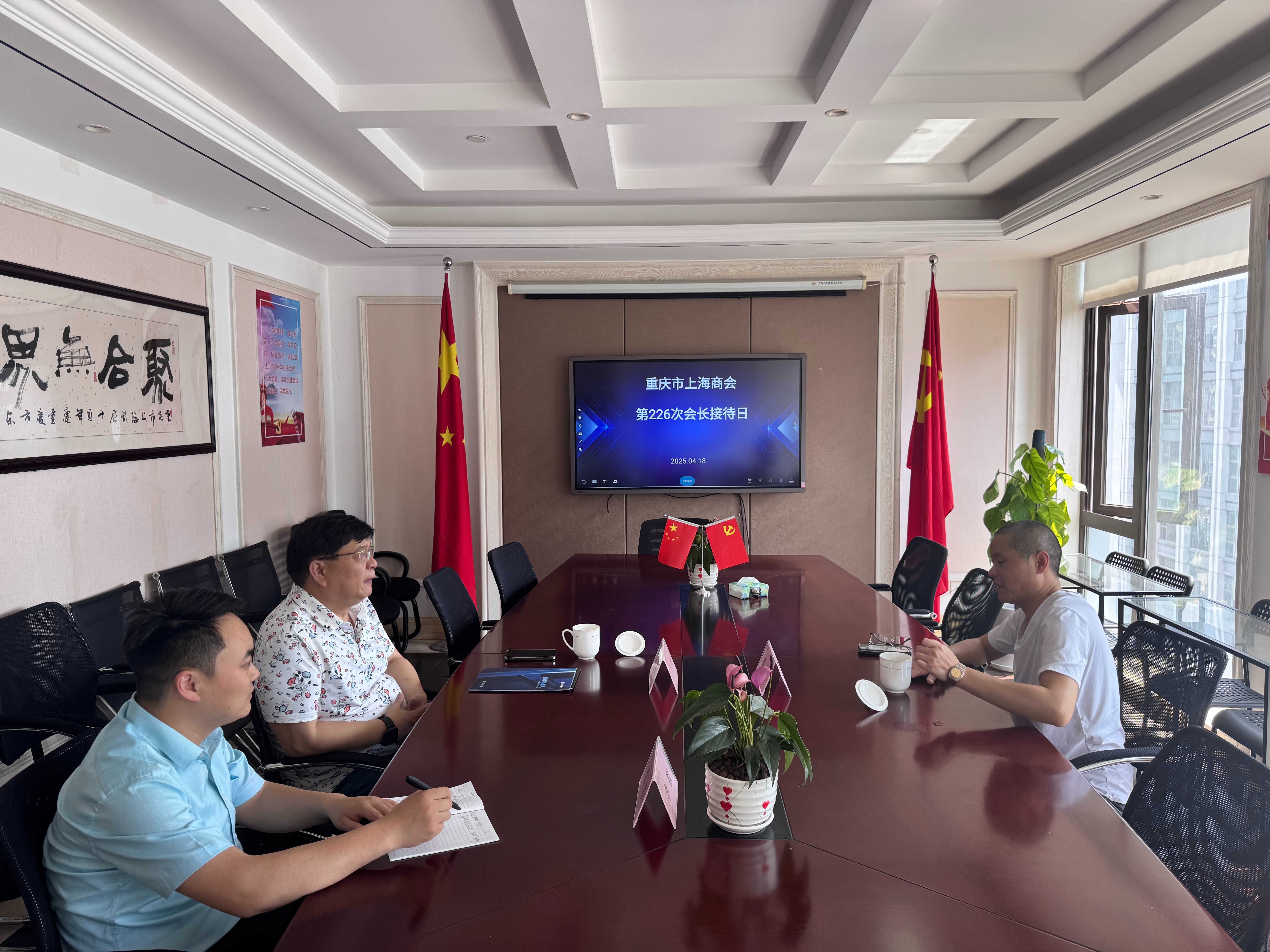 接着,韦根一同接待了重庆居佳行商贸有限公司总经理吴宇骞、四川科通达建设工程有限公司总经理陈勇。吴宇骞介绍,公司通过为地产公司定制全屋装修大礼包,助力新房销售,同时代销普渡机器人,应用于酒店、商超等场所的服务工作。他希望借助商会平台,获得更多市场信息,拓展更多合作机会。陈勇介绍,公司正从工程业务向光伏项目转型,彭水的石英矿、萤石矿开采加工项目也在稳步推进,已引进申通、中通两家企业,征地200亩,加速推进项目落地,期望韦根会长能推荐相关企业赴彭水考察项目,推动项目落地与企业转型升级。