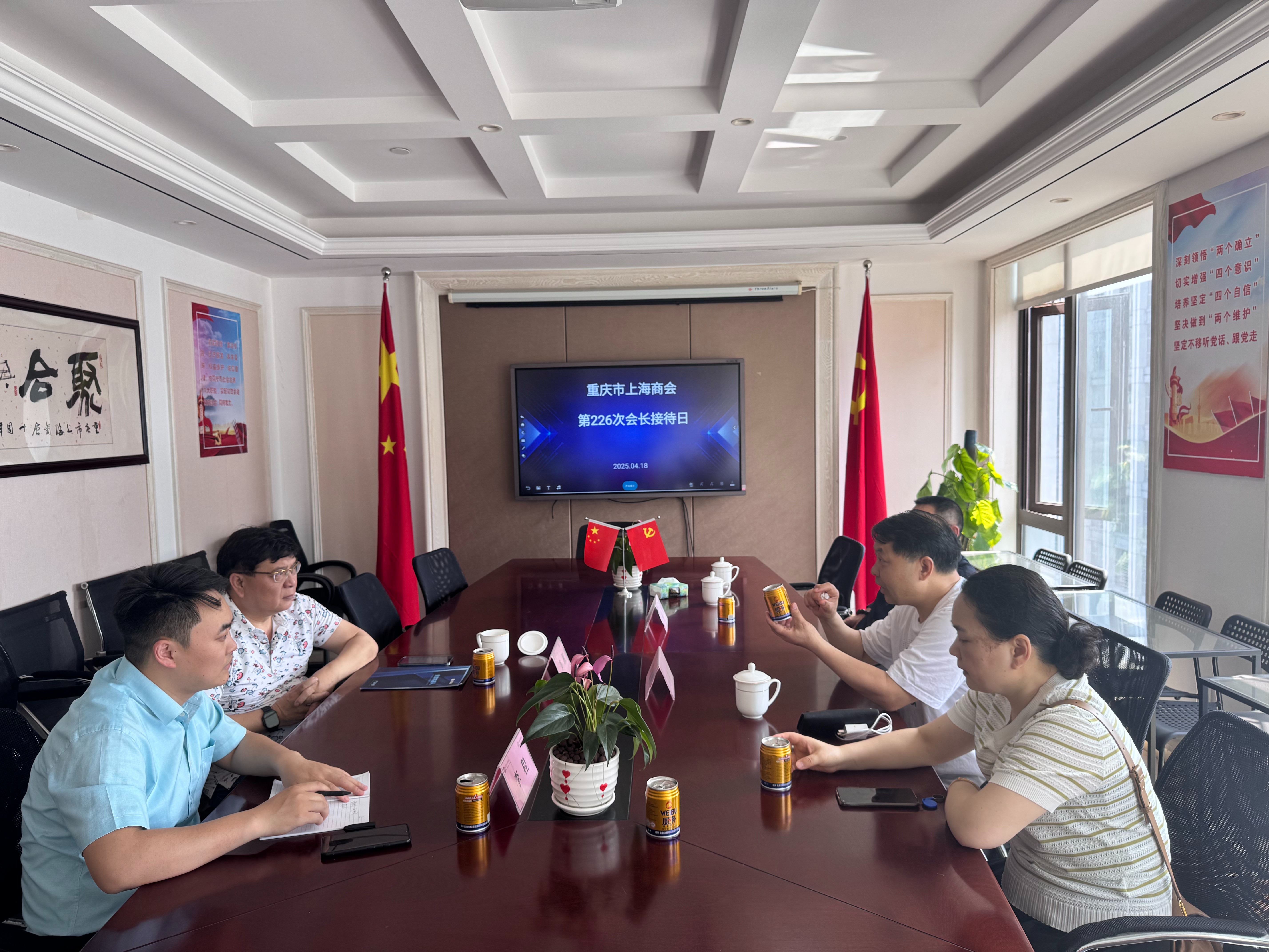 紧接着,韦根接待了重庆哥比国际贸易有限公司董事长刘天国、营销总裁雷德平一行3人。刘天国介绍了公司是一家专注全球高品质饮品研发,公司在简阳市生产的 “威补” 能量饮料,能在运动、驾驶等场景下迅速为消费者补充能量,在全国有81个区县代购商,300多家超市和100多个中石化、中石油服务区销售产品。此次拜访韦根会长,希望借助商会的平台,建立更广泛的销售渠道,加速打开重庆、上海市场。韦根表示商会愿意为企业发展助力赋能,同时提出:一是欢迎“威补”饮料入驻“重庆市上海商会商城”平台销售;二是推荐罗森、新沃购供应链等会员企业以及友好商会与企业建立合作关系,拓宽销售渠道;三是建议公司做差异化产品,与市场相关主流产品有细分区别,进一步提升“威补”能量饮料的亮点和功能,打造“爆款”产品迅速打开市场。