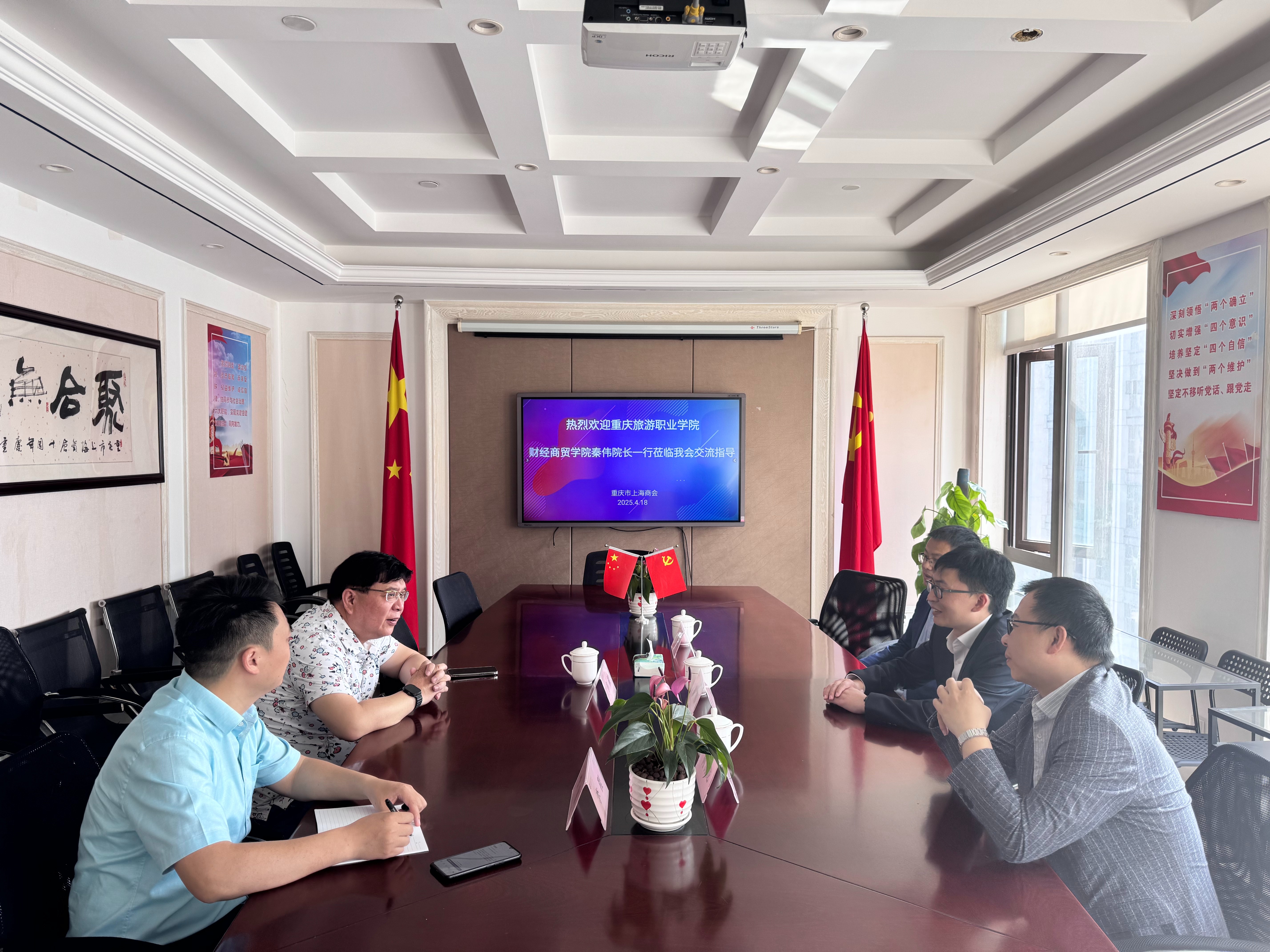 上午九时许,韦根热情接待了重庆旅游职业学院财经商贸学院院长秦伟、校企合作负责人何海龙、会计教研室负责人向洪爱。双方分别介绍了商会概况、学院情况,围绕学生实训、企业招聘等话题深入交流,达成了商院合作的共识。