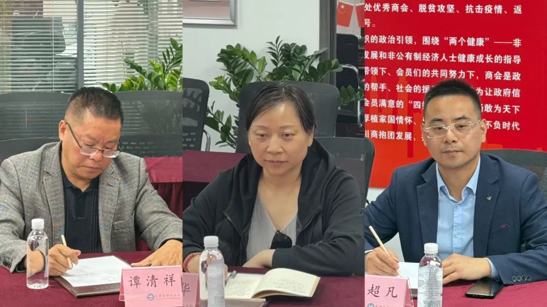 2025年4月25日上午,遂宁市驻北京片区流动党委副书记邓欣、党委委员王小华、遂宁市在津冀晋地区流动党员天津支部筹备组谭清祥一行莅临天津市四川商会拜访交流,商会副会长王志、贾国栋、副秘书长李超凡、办公室主任赵鑫代表商会热情接待。副会长贾国栋代表商会致欢迎词,他首先对邓欣副书记一行的到来表示了热烈的欢迎,天津市四川商会自成立以来,积极团结在津川籍企业家,搭建起政企沟通、商务合作、文化交流的多元平台。商会现有会员企业约200余家,覆盖建筑、科技、金融、法律等多个领域,为促进津川两地经济文化交流合作做出了积极贡献。天津与遂宁虽相隔千里,但同为成渝地区双城经济圈与京津冀协同发展两大国家战略的重要节点,合作前景广阔。商会愿以此为契机,联动在津川商资源,为遂宁市政府对接天津的相关企业,助力家乡“双招双引”。同时,商会也将学习遂宁在流动党员服务管理中的创新经验,提升在津川籍党员的归属感与凝聚力。邓欣副书记对商会的热情接待表示了感谢,她代表遂宁市驻北京片区流动党委,向商会全体同仁致以最诚挚的感谢——感谢你们以党建为旗、以乡情为桥,为在津川籍党员筑起温暖的“红色港湾”,为务工乡友撑起坚实的“维权后盾”,更以实干担当助力家乡发展,用“川商智慧”书写了“反哺桑梓”的动人篇章!未来,流动党委愿与商会同心同行,让党建联建的纽带更紧、乡友服务的温度更暖、协同发展的步子更实!谢谢大家!双方围绕“党建引领、服务乡友、协同发展”展开深度交流,为川商在京津冀与成渝双圈融合发展中注入新动能。王志总结讲话,他表示,家乡政府远赴千里,为在津企业家赋能,使我们的心里感到无比的温暖,今天的交流是乡情的延续,更是合作的起点。我们期待与遂宁市驻京流动党委建立常态化沟通机制,通过党建联建、项目对接、人才交流等形式,推动资源互补、信息互通、发展互促。商会愿发挥桥梁纽带作用,助力遂宁籍在津党员企业家反哺家乡,为遂宁“全国百强”进位、“再创县域辉煌”贡献川商力量!