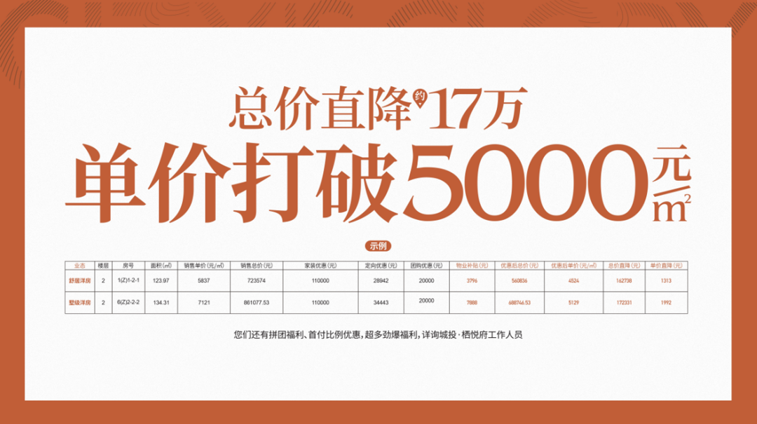 舒适洋房123.97平米,单价5837元,销售总价723574元,家装优惠110000元,优惠后总价只需560836元;