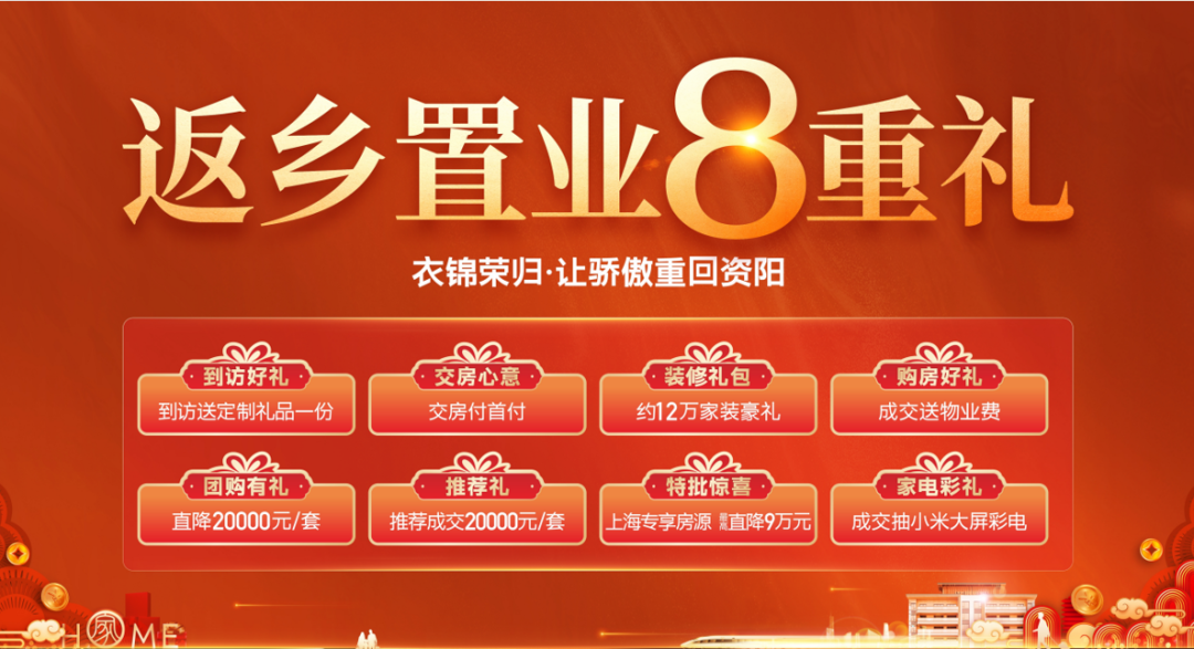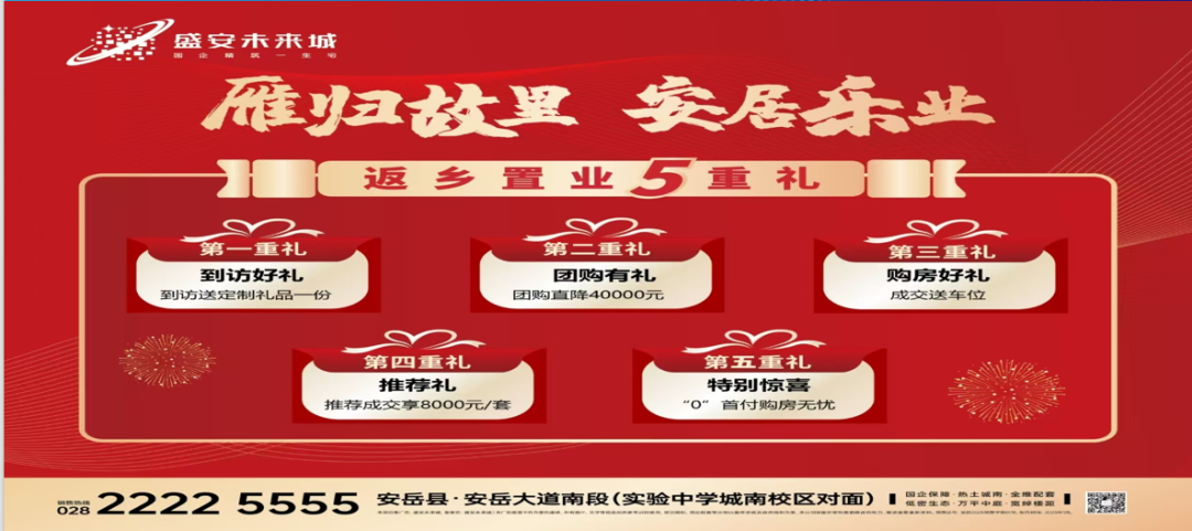 返乡置业将拥有5重礼,到访好友礼、团购直降40000元、成交送车位、推荐成交享8000元/套、特别惊喜零首付购房无忧。