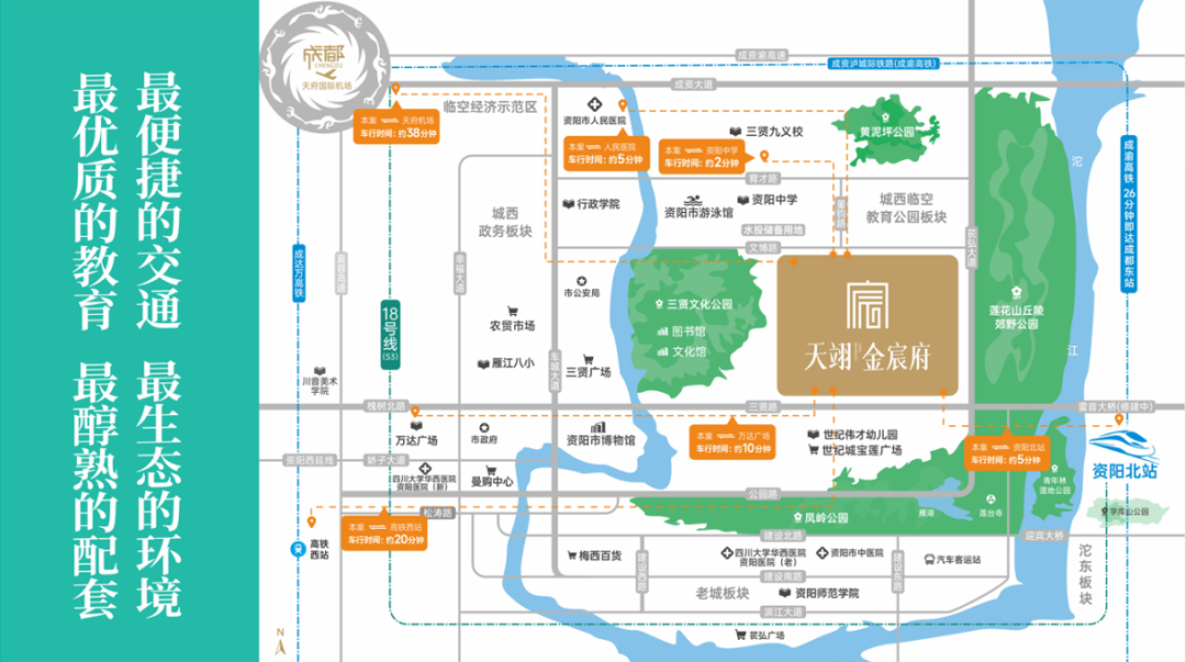 再如元帅故里天池绿都,这是成渝黄金分割点•绿色发展示范区,乐至是陈毅元帅的故乡,地处成渝直线黄金分割点,距天府国际机场40分钟、重庆新机场60分钟车程,是成都东进 “第一站”、重庆西向“必经地”。作为唯一直线联成渝、东西接遂资的交通节点城市,乐至正加快融入成渝国际都市圈,乐至已经迎来“双城记”时代。